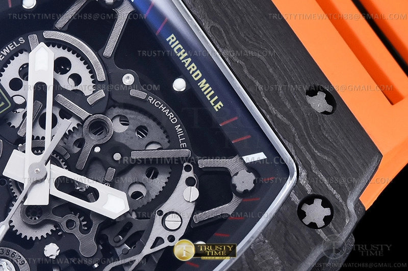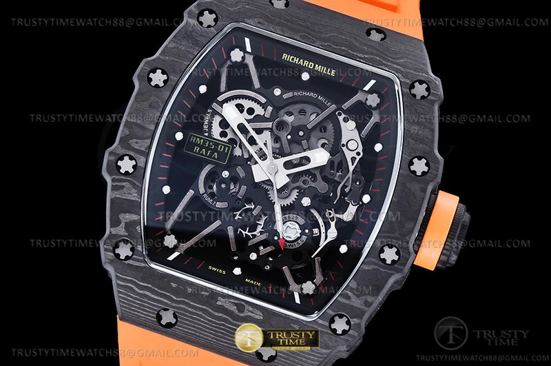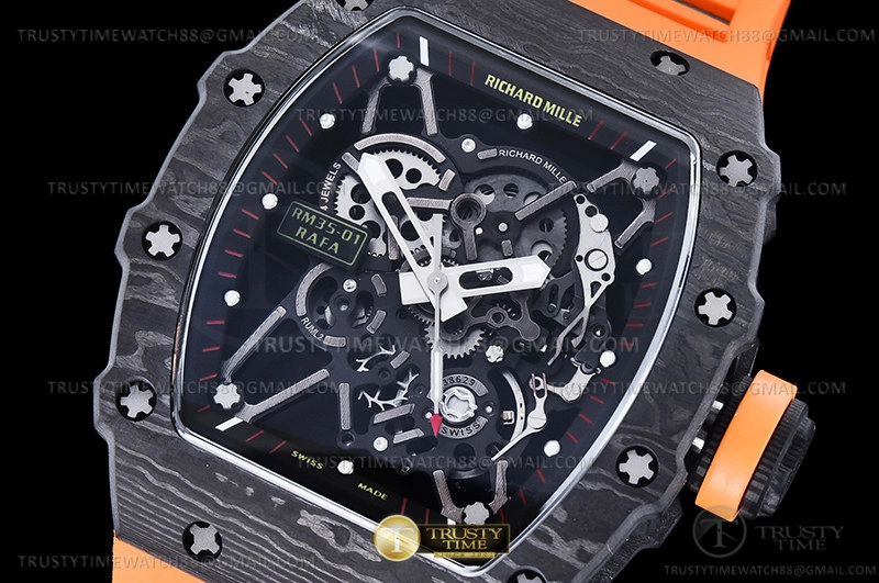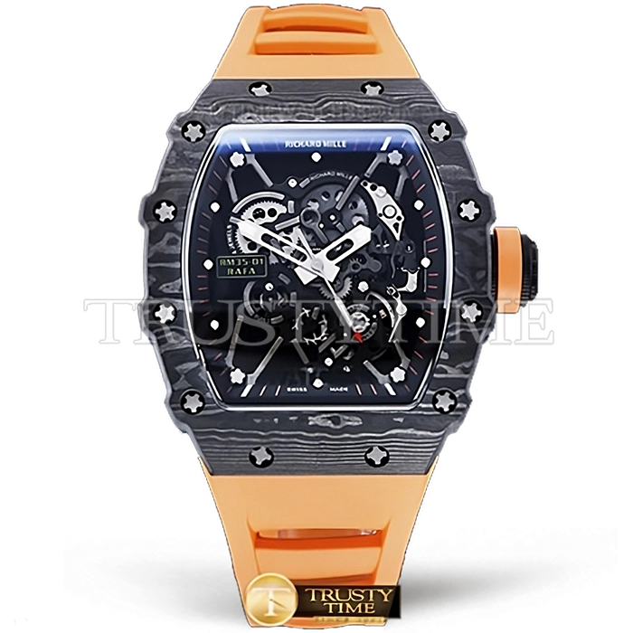Часы Richard Mille из коллекции RM035. Спортивные мужские часы Richard Mille RM035-01 Rafael Nadal премиального качества (Артикул магазина: RM-0582) оснащены надежным автоматическим механизмом с ручным заводом калибра RMUL3, в котором реализованы следующие функции: часовая, минутная и секундная стрелки, а так же максимально простой функционал без усложнений. Бочкообразный корпус часов черного цвета, имеющий размер 50 мм x 43 мм и высоту 14 мм превосходно дополнит образ и украсит запястье своего обладателя. Для изготовления часов Richard Mille RM035-01 Rafael Nadal предлагаемых в нашем интернет-магазине, применяются карбон NTPT высокого качества (Швейцарский стандарт), а так же сапфировое стекло высокой прочности, благодаря чему обеспечивается максимальная защита от сколов и механических повреждений. Отличительной чертой данной модели является скелетонизированный циферблат, часовые индексы которого обеспечивают часовые метки. Завершает образ каучуковый ремешок оранжевого цвета с фирменной раскладывающейся застежкой Richard Mille. Водонепроницаемость данной модели составляет 30М (WR30) – допускается минимальное воздействие с водой.