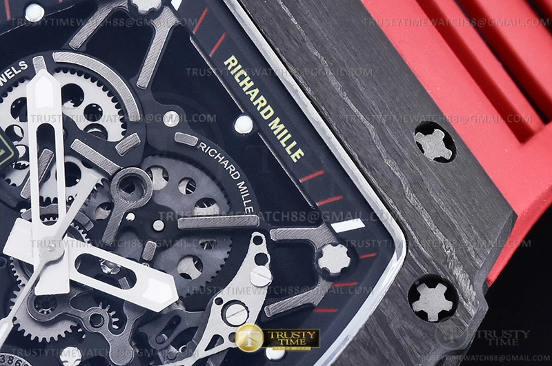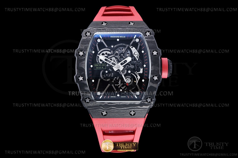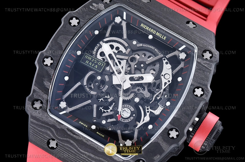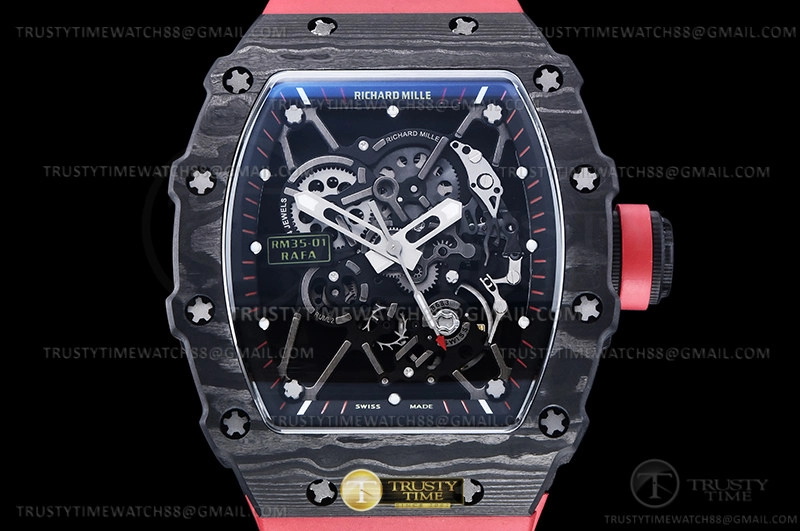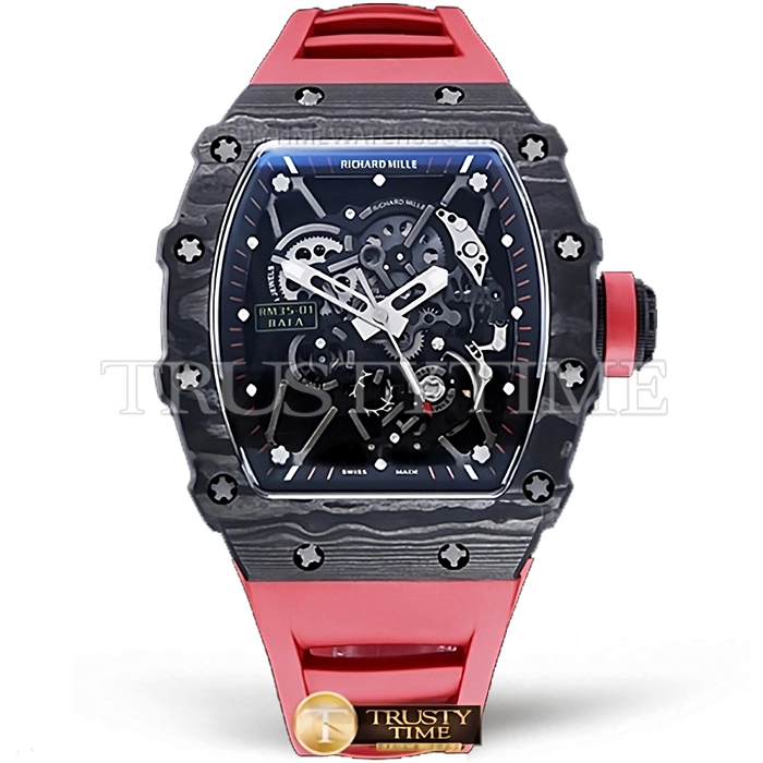 Часы Richard Mille из коллекции RM035. Спортивные мужские часы Richard Mille RM035-01 Rafael Nadal премиального качества (Артикул магазина: RM-0583) оснащены надежным автоматическим механизмом с ручным заводом калибра RMUL3, в котором реализованы следующие функции: часовая, минутная и секундная стрелки, а так же максимально простой функционал без усложнений. Бочкообразный корпус часов черного цвета, имеющий размер 50 мм x 43 мм и высоту 14 мм превосходно дополнит образ и украсит запястье своего обладателя. Для изготовления часов Richard Mille RM035-01 Rafael Nadal предлагаемых в нашем интернет-магазине, применяются карбон NTPT высокого качества (Швейцарский стандарт), а так же сапфировое стекло высокой прочности, благодаря чему обеспечивается максимальная защита от сколов и механических повреждений. Отличительной чертой данной модели является скелетонизированный циферблат, часовые индексы которого обеспечивают часовые метки. Завершает образ каучуковый ремешок красного цвета с фирменной раскладывающейся застежкой Richard Mille. Водонепроницаемость данной модели составляет 30М (WR30) – допускается минимальное воздействие с водой.