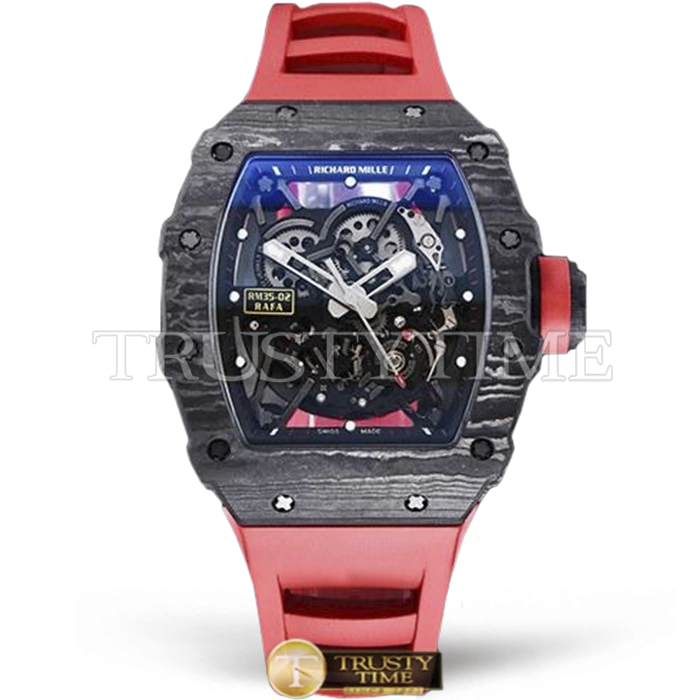 Часы Richard Mille из коллекции RM035-02. Спортивные мужские часы Richard Mille RM035-02 Rafael Nadal премиального качества (Артикул магазина: RM-0591) оснащены надежным автоматическим механизмом с автоподзаводом (работает от амплитуды движения руки) калибра RMAL1, в котором реализованы следующие функции: часовая, минутная и секундная стрелки, а так же максимально простой функционал без усложнений. Бочкообразный корпус часов черного цвета, имеющий размер 50 мм x 44.5 мм и высоту 14 мм превосходно дополнит образ и украсит запястье своего обладателя. Для изготовления часов Richard Mille RM035-02 Rafael Nadal предлагаемых в нашем интернет-магазине, применяются карбон NTPT высокого качества (Швейцарский стандарт), а так же сапфировое стекло высокой прочности, благодаря чему обеспечивается максимальная защита от сколов и механических повреждений. Отличительной чертой данной модели является скелетонизированный циферблат, часовые индексы которого обеспечивают часовые метки. Завершает образ каучуковый ремешок красного цвета с фирменной раскладывающейся застежкой Richard Mille. Водонепроницаемость данной модели составляет 30М (WR30) – допускается минимальное воздействие с водой.