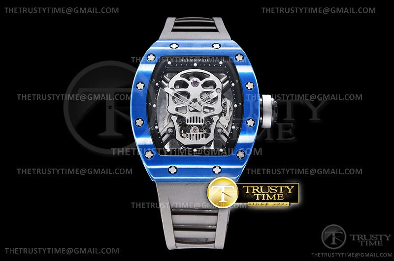 Часы Richard Mille из коллекции RM052. Спортивные мужские часы Richard Mille RM052 Skull Tourbillon премиального качества (Артикул магазина: RM-0511) оснащены надежным автоматическим механизмом с ручным заводом калибра Seagull Handwind Tourbillon, в котором реализованы следующие функции: часова и минутка стрелки, а так же турбийон. Бочкообразный корпус часов синего цвета, имеющий размер 43 мм X 50 мм и высоту 16 мм превосходно дополнит образ и украсит запястье своего обладателя. Для изготовления часов Richard Mille RM052 Skull Tourbillon предлагаемых в нашем интернет-магазине, применяются карбон NTPT высокого качества (Швейцарский стандарт), а так же сапфировое стекло высокой прочности, благодаря чему обеспечивается максимальная защита от сколов и механических повреждений. Отличительной чертой данной модели является скелетонизированный циферблат, часовые индексы которого обеспечивают часовые метки. Завершает образ каучуковый ремешок серого цвета с фирменной раскладывающейся застежкой Richard Mille. Водонепроницаемость данной модели составляет 30М (WR30) – допускается минимальное воздействие с водой.