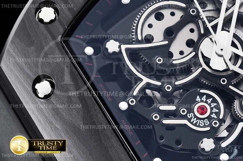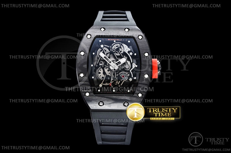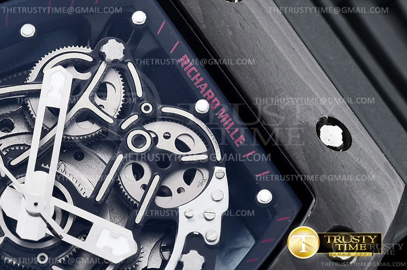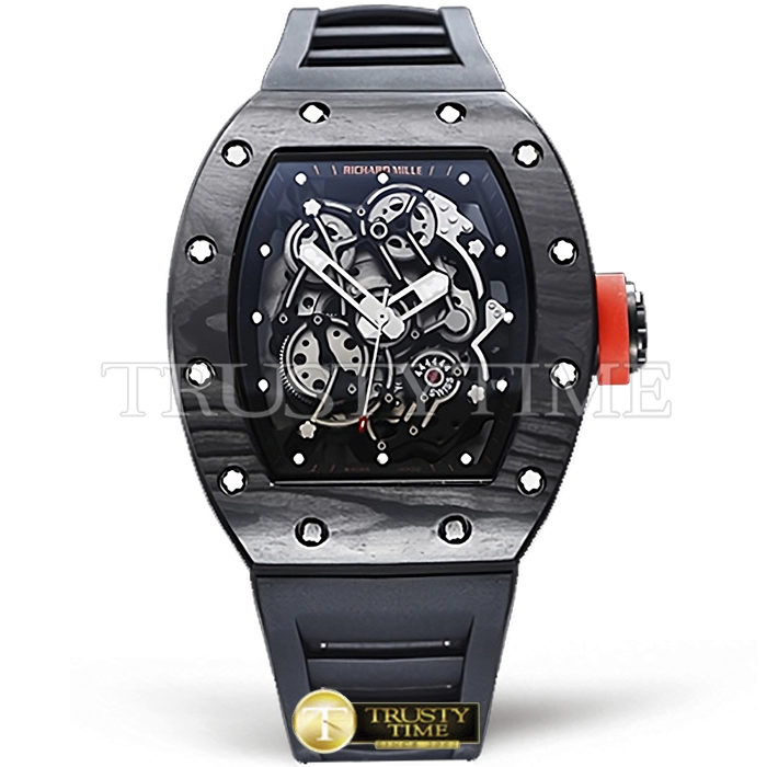 Часы Richard Mille из коллекции RM055. Спортивные мужские часы Richard Mille RM055 Bubba Watson премиального качества (Артикул магазина: RM-0531) оснащены надежным автоматическим механизмом с автоподзаводом (работает от амплитуды движения руки) калибра MY9015, в котором реализованы следующие функции: часовая, минутная и секундная стрелки, а так же максимально простой функционал без усложнений. Бочкообразный корпус часов черного цвета, имеющий размер 43 мм и высоту 17.5 мм превосходно дополнит образ и украсит запястье своего обладателя. Для изготовления часов Richard Mille RM055 Bubba Watson предлагаемых в нашем интернет-магазине, применяются кованый карбон высокого качества (Швейцарский стандарт), а так же сапфировое стекло высокой прочности, благодаря чему обеспечивается максимальная защита от сколов и механических повреждений. Отличительной чертой данной модели является скелетонизированный циферблат, часовые индексы которого обеспечивают часовые метки. Завершает образ каучуковый ремешок черного цвета с фирменной раскладывающейся застежкой Richard Mille. Водонепроницаемость данной модели составляет 30М (WR30) – допускается минимальное воздействие с водой.