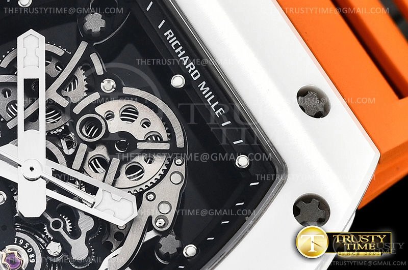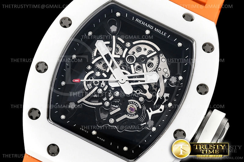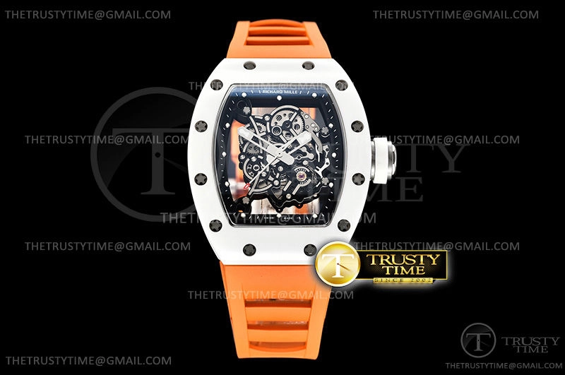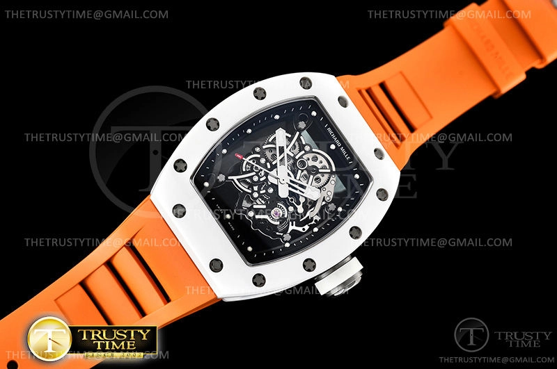 Часы Richard Mille из коллекции RM055. Спортивные мужские часы Richard Mille RM055 Bubba Watson премиального качества (Артикул магазина: RM-0449) оснащены надежным автоматическим механизмом с автоподзаводом (работает от амплитуды движения руки) калибра MY8215, в котором реализованы следующие функции: часовая, минутная и секундная стрелки, а так же максимально простой функционал без усложнений. Бочкообразный корпус часов белого цвета, имеющий размер 42 мм и высоту 17 мм превосходно дополнит образ и украсит запястье своего обладателя. Для изготовления часов Richard Mille RM055 Bubba Watson предлагаемых в нашем интернет-магазине, применяются керамика высокого качества (Швейцарский стандарт), а так же сапфировое стекло высокой прочности, благодаря чему обеспечивается максимальная защита от сколов и механических повреждений. Отличительной чертой данной модели является скелетонизированный циферблат, часовые индексы которого обеспечивают часовые метки. Завершает образ каучуковый ремешок оранжевого цвета с фирменной раскладывающейся застежкой Richard Mille. Водонепроницаемость данной модели составляет 30М (WR30) – допускается минимальное воздействие с водой.