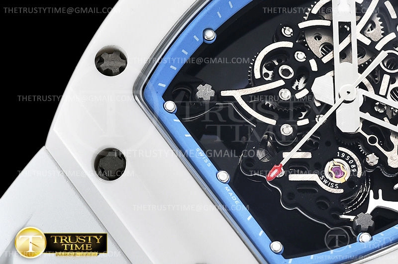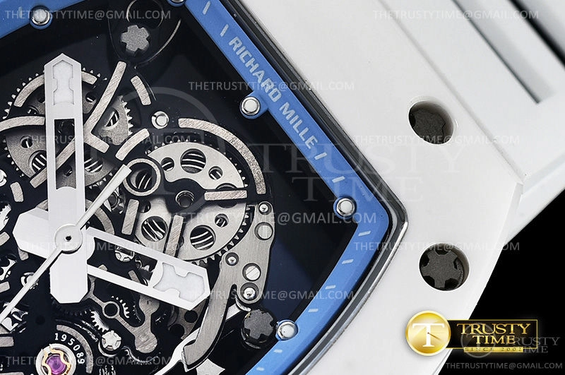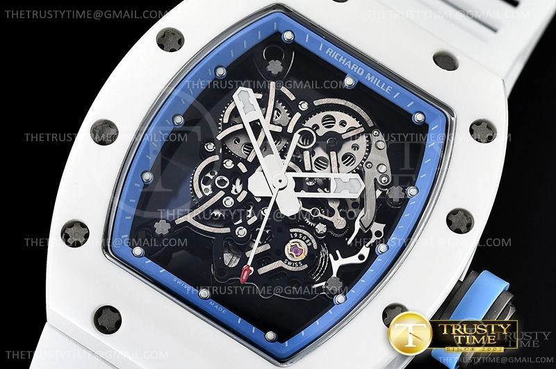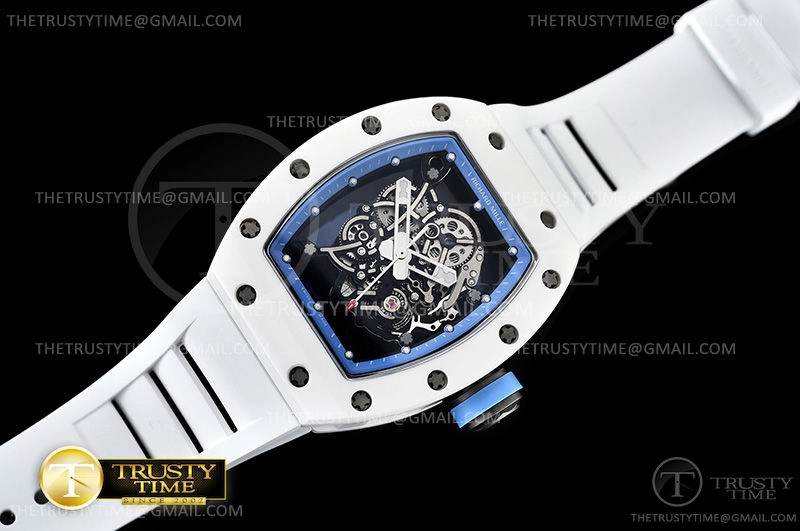 Часы Richard Mille из коллекции RM055. Спортивные мужские часы Richard Mille RM055 Bubba Watson премиального качества (Артикул магазина: RM-0444) оснащены надежным автоматическим механизмом с автоподзаводом (работает от амплитуды движения руки) калибра MY8215, в котором реализованы следующие функции: часовая, минутная и секундная стрелки, а так же максимально простой функционал без усложнений. Бочкообразный корпус часов белого цвета, имеющий размер 42 мм и высоту 17 мм превосходно дополнит образ и украсит запястье своего обладателя. Для изготовления часов Richard Mille RM055 Bubba Watson предлагаемых в нашем интернет-магазине, применяются керамика высокого качества (Швейцарский стандарт), а так же сапфировое стекло высокой прочности, благодаря чему обеспечивается максимальная защита от сколов и механических повреждений. Отличительной чертой данной модели является скелетонизированный циферблат, часовые индексы которого обеспечивают часовые метки. Завершает образ каучуковый ремешок белого цвета с фирменной раскладывающейся застежкой Richard Mille. Водонепроницаемость данной модели составляет 30М (WR30) – допускается минимальное воздействие с водой.