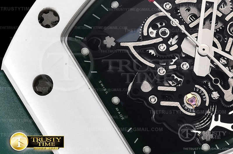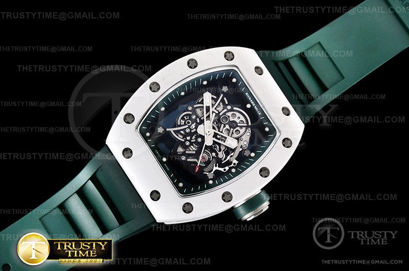 Часы Richard Mille из коллекции RM055. Спортивные мужские часы Richard Mille RM055 Bubba Watson премиального качества (Артикул магазина: RM-0443) оснащены надежным автоматическим механизмом с автоподзаводом (работает от амплитуды движения руки) калибра MY8215, в котором реализованы следующие функции: часовая, минутная и секундная стрелки, а так же максимально простой функционал без усложнений. Бочкообразный корпус часов белого цвета, имеющий размер 42 мм и высоту 17 мм превосходно дополнит образ и украсит запястье своего обладателя. Для изготовления часов Richard Mille RM055 Bubba Watson предлагаемых в нашем интернет-магазине, применяются керамика высокого качества (Швейцарский стандарт), а так же сапфировое стекло высокой прочности, благодаря чему обеспечивается максимальная защита от сколов и механических повреждений. Отличительной чертой данной модели является скелетонизированный циферблат, часовые индексы которого обеспечивают часовые метки. Завершает образ каучуковый ремешок зеленого цвета с фирменной раскладывающейся застежкой Richard Mille. Водонепроницаемость данной модели составляет 30М (WR30) – допускается минимальное воздействие с водой.