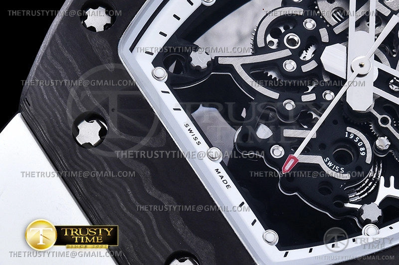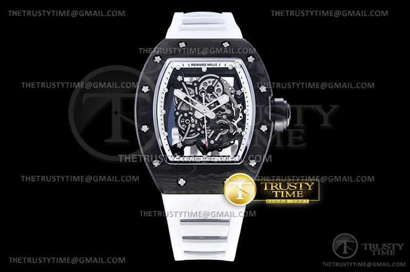 Часы Richard Mille из коллекции RM055. Спортивные мужские часы Richard Mille RM055 Bubba Watson V2 премиального качества (Артикул магазина: RM-0523) оснащены надежным автоматическим механизмом с автоподзаводом (работает от амплитуды движения руки) калибра MY8215, в котором реализованы следующие функции: часовая, минутная и секундная стрелки, а так же максимально простой функционал без усложнений. Бочкообразный корпус часов черного цвета, имеющий размер 42 мм и высоту 17 мм превосходно дополнит образ и украсит запястье своего обладателя. Для изготовления часов Richard Mille RM055 Bubba Watson V2 предлагаемых в нашем интернет-магазине, применяются кованый карбон высокого качества (Швейцарский стандарт), а так же сапфировое стекло высокой прочности, благодаря чему обеспечивается максимальная защита от сколов и механических повреждений. Отличительной чертой данной модели является скелетонизированный циферблат, часовые индексы которого обеспечивают часовые метки. Завершает образ каучуковый ремешок белого цвета с фирменной раскладывающейся застежкой Richard Mille. Водонепроницаемость данной модели составляет 30М (WR30) – допускается минимальное воздействие с водой.