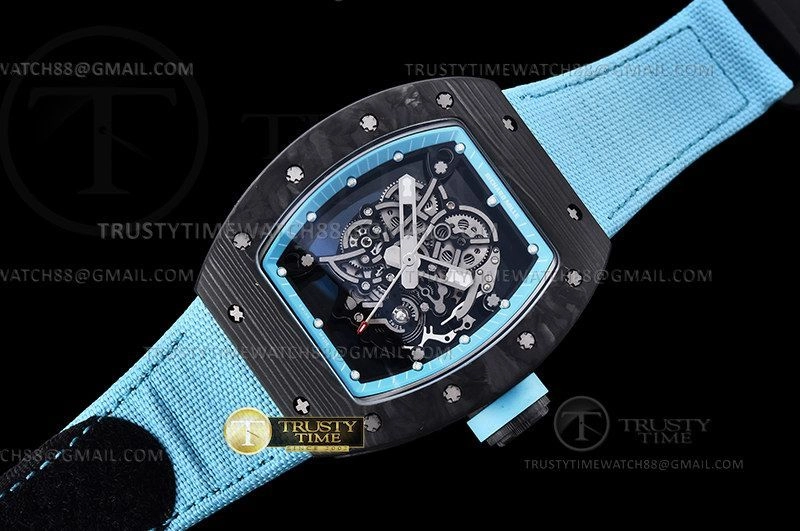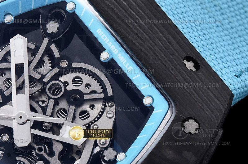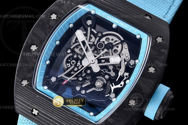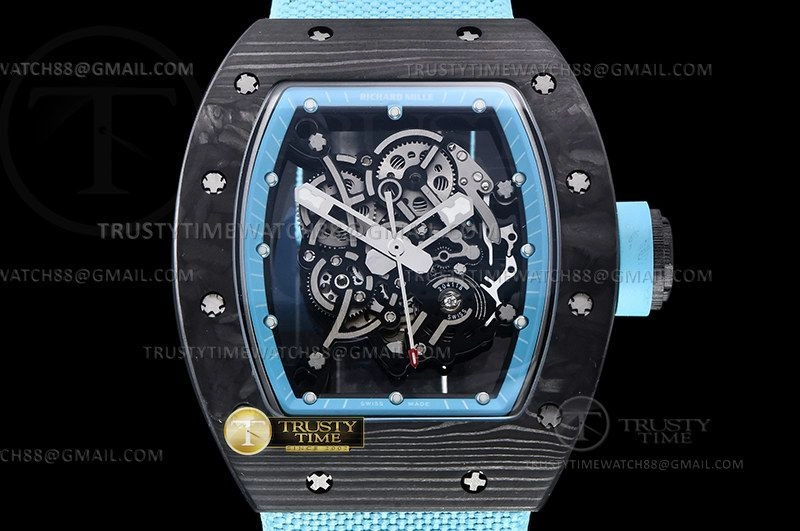 Часы Richard Mille из коллекции RM055. Спортивные мужские часы Richard Mille RM055 Yas Marina Circuit премиального качества (Артикул магазина: RM-0562) оснащены надежным автоматическим механизмом с ручным заводом калибра Seiko NH05A, в котором реализованы следующие функции: часовая, минутная и секундная стрелки, а так же максимально простой функционал без усложнений. Бочкообразный корпус часов черного цвета, имеющий размер 42 мм X 50 мм и высоту 12.5 мм превосходно дополнит образ и украсит запястье своего обладателя. Для изготовления часов Richard Mille RM055 Yas Marina Circuit предлагаемых в нашем интернет-магазине, применяются карбон NTPT высокого качества (Швейцарский стандарт), а так же сапфировое стекло высокой прочности, благодаря чему обеспечивается максимальная защита от сколов и механических повреждений. Отличительной чертой данной модели является скелетонизированный циферблат, часовые индексы которого обеспечивают часовые метки. Завершает образ нейлоновый ремешок голубого цвета на липучке Richard Mille. Водонепроницаемость данной модели составляет 30М (WR30) – допускается минимальное воздействие с водой.