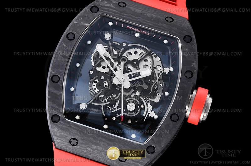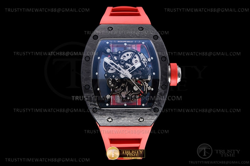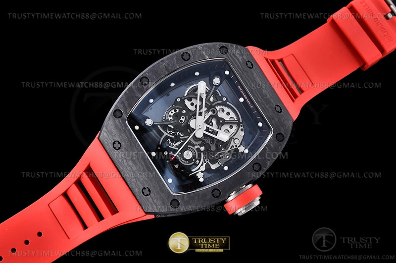 Часы Richard Mille из коллекции RM055. Спортивные мужские часы Richard Mille RM055 Bubba Watson премиального качества (Артикул магазина: RM-0567) оснащены надежным автоматическим механизмом с ручным заводом калибра RMUL2, в котором реализованы следующие функции: часовая, минутная и секундная стрелки, а так же максимально простой функционал без усложнений. Бочкообразный корпус часов черного цвета, имеющий размер 49.9 мм x 42.7 мм и высоту 13.5 мм превосходно дополнит образ и украсит запястье своего обладателя. Для изготовления часов Richard Mille RM055 Bubba Watson предлагаемых в нашем интернет-магазине, применяются карбон NTPT высокого качества (Швейцарский стандарт), а так же сапфировое стекло высокой прочности, благодаря чему обеспечивается максимальная защита от сколов и механических повреждений. Отличительной чертой данной модели является скелетонизированный циферблат, часовые индексы которого обеспечивают часовые метки. Завершает образ каучуковый ремешок красного цвета с фирменной раскладывающейся застежкой Richard Mille. Водонепроницаемость данной модели составляет 30М (WR30) – допускается минимальное воздействие с водой.