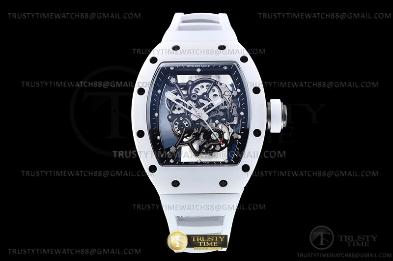 Часы Richard Mille из коллекции RM055. Спортивные мужские часы Richard Mille RM055 Bubba Watson премиального качества (Артикул магазина: RM-0559) оснащены надежным автоматическим механизмом с ручным заводом калибра RMUL2, в котором реализованы следующие функции: часовая, минутная и секундная стрелки, а так же максимально простой функционал без усложнений. Бочкообразный корпус часов белого цвета, имеющий размер 49.9 мм x 42.7 мм и высоту 13.5 мм превосходно дополнит образ и украсит запястье своего обладателя. Для изготовления часов Richard Mille RM055 Bubba Watson предлагаемых в нашем интернет-магазине, применяются керамика высокого качества (Швейцарский стандарт), а так же сапфировое стекло высокой прочности, благодаря чему обеспечивается максимальная защита от сколов и механических повреждений. Отличительной чертой данной модели является скелетонизированный циферблат, часовые индексы которого обеспечивают часовые метки. Завершает образ каучуковый ремешок белого цвета с фирменной раскладывающейся застежкой Richard Mille. Водонепроницаемость данной модели составляет 30М (WR30) – допускается минимальное воздействие с водой.