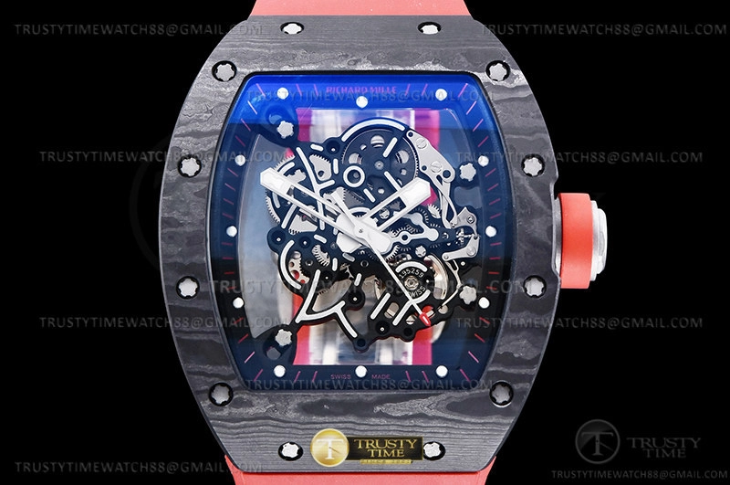 Часы Richard Mille из коллекции RM055. Спортивные мужские часы Richard Mille RM055 Bubba Watson премиального качества (Артикул магазина: RM-0593) оснащены надежным автоматическим механизмом с ручным заводом калибра RMUL2, в котором реализованы следующие функции: часовая, минутная и секундная стрелки, а так же максимально простой функционал без усложнений. Бочкообразный корпус часов черного цвета, имеющий размер 49.9 мм x 42.7 мм и высоту 13.5 мм превосходно дополнит образ и украсит запястье своего обладателя. Для изготовления часов Richard Mille RM055 Bubba Watson предлагаемых в нашем интернет-магазине, применяются карбон NTPT высокого качества (Швейцарский стандарт), а так же сапфировое стекло высокой прочности, благодаря чему обеспечивается максимальная защита от сколов и механических повреждений. Отличительной чертой данной модели является скелетонизированный циферблат, часовые индексы которого обеспечивают часовые метки. Завершает образ каучуковый ремешок красного цвета с фирменной раскладывающейся застежкой Richard Mille. Водонепроницаемость данной модели составляет 30М (WR30) – допускается минимальное воздействие с водой.