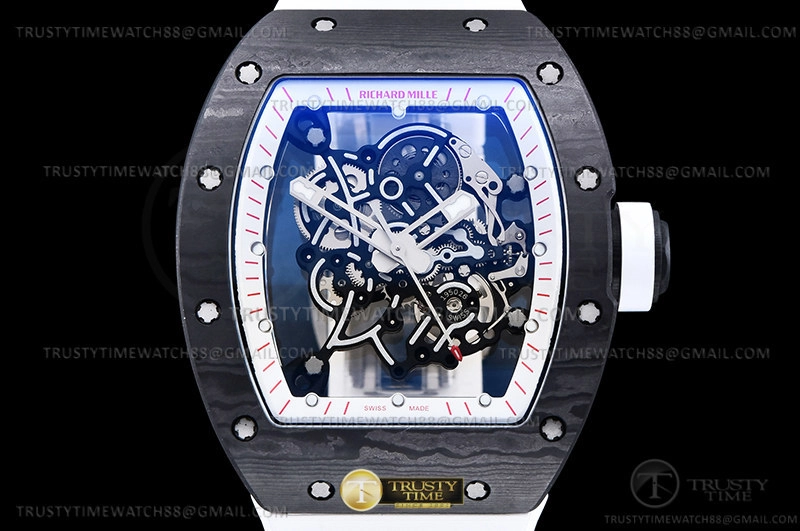 Часы Richard Mille из коллекции RM055. Спортивные мужские часы Richard Mille RM055 Bubba Watson премиального качества (Артикул магазина: RM-0594) оснащены надежным автоматическим механизмом с ручным заводом калибра RMUL2, в котором реализованы следующие функции: часовая, минутная и секундная стрелки, а так же максимально простой функционал без усложнений. Бочкообразный корпус часов черного цвета, имеющий размер 49.9 мм x 42.7 мм и высоту 13.5 мм превосходно дополнит образ и украсит запястье своего обладателя. Для изготовления часов Richard Mille RM055 Bubba Watson предлагаемых в нашем интернет-магазине, применяются карбон NTPT высокого качества (Швейцарский стандарт), а так же сапфировое стекло высокой прочности, благодаря чему обеспечивается максимальная защита от сколов и механических повреждений. Отличительной чертой данной модели является скелетонизированный циферблат, часовые индексы которого обеспечивают часовые метки. Завершает образ каучуковый ремешок белого цвета с фирменной раскладывающейся застежкой Richard Mille. Водонепроницаемость данной модели составляет 30М (WR30) – допускается минимальное воздействие с водой.