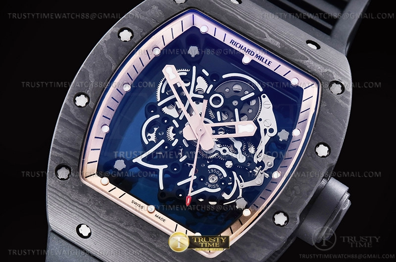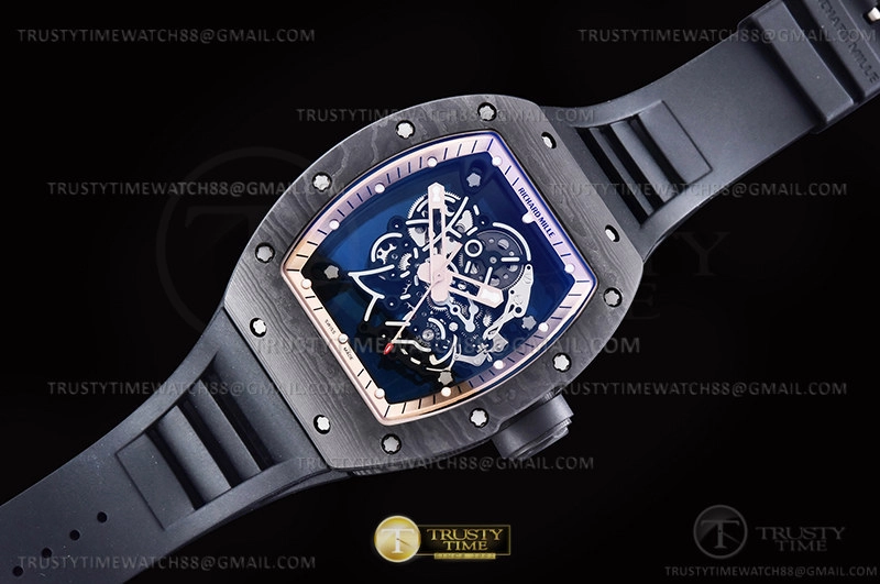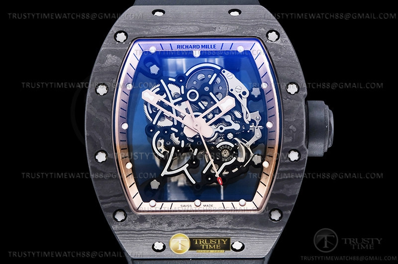 Часы Richard Mille из коллекции RM055. Спортивные мужские часы Richard Mille RM055 Bubba Watson премиального качества (Артикул магазина: RM-0598) оснащены надежным автоматическим механизмом с ручным заводом калибра RMUL2, в котором реализованы следующие функции: часовая, минутная и секундная стрелки, а так же максимально простой функционал без усложнений. Бочкообразный корпус часов черного цвета, имеющий размер 49.9 мм x 42.7 мм и высоту 13.5 мм превосходно дополнит образ и украсит запястье своего обладателя. Для изготовления часов Richard Mille RM055 Bubba Watson предлагаемых в нашем интернет-магазине, применяются карбон NTPT высокого качества (Швейцарский стандарт), а так же сапфировое стекло высокой прочности, благодаря чему обеспечивается максимальная защита от сколов и механических повреждений. Отличительной чертой данной модели является скелетонизированный циферблат, часовые индексы которого обеспечивают часовые метки. Завершает образ каучуковый ремешок черного цвета с фирменной раскладывающейся застежкой Richard Mille. Водонепроницаемость данной модели составляет 30М (WR30) – допускается минимальное воздействие с водой.