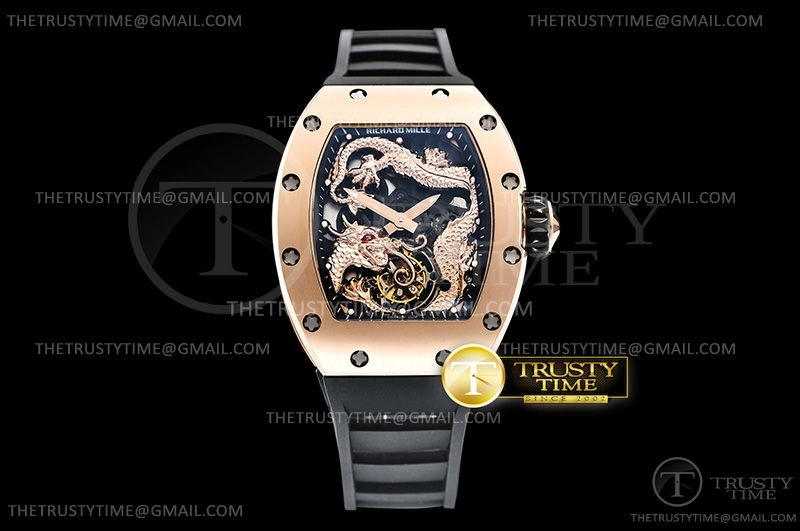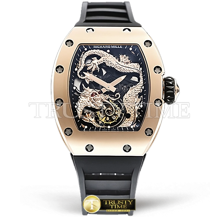 Часы Richard Mille из коллекции RM057. Спортивные мужские часы Richard Mille RM057 Tourbillon Dragon Jackie Chan премиального качества (Артикул магазина: RM-0479) оснащены надежным автоматическим механизмом с ручным заводом калибра Seagull Handwind Tourbillon, в котором реализованы следующие функции: часова и минутка стрелки, а так же турбийон. Бочкообразный корпус часов розового цвета, имеющий размер 41 мм X 50 мм и высоту 14 мм превосходно дополнит образ и украсит запястье своего обладателя. Для изготовления часов Richard Mille RM057 Tourbillon Dragon Jackie Chan предлагаемых в нашем интернет-магазине, применяются нержавеющая сталь 316F высокого качества (Швейцарский стандарт), а так же сапфировое стекло высокой прочности, благодаря чему обеспечивается максимальная защита от сколов и механических повреждений. Отличительной чертой данной модели является черный циферблат, часовые индексы которого обеспечивают часовые метки. Завершает образ каучуковый ремешок черного цвета с фирменной раскладывающейся застежкой Richard Mille. Водонепроницаемость данной модели составляет 30М (WR30) – допускается минимальное воздействие с водой.