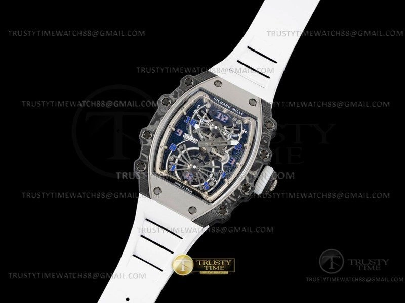 Часы Richard Mille из коллекции RM21-01. Классические мужские часы Richard Mille RM21-01 Tourbillon Aerodyne премиального качества (Артикул магазина: RM-0556) оснащены надежным автоматическим механизмом с ручным заводом калибра Seagull Handwind Tourbillon, в котором реализованы следующие функции: часова и минутка стрелки, а так же турбийон. Бочкообразный корпус часов черного цвета, имеющий размер 51 мм x 43 мм и высоту 16.5 мм превосходно дополнит образ и украсит запястье своего обладателя. Для изготовления часов Richard Mille RM21-01 Tourbillon Aerodyne предлагаемых в нашем интернет-магазине, применяются карбон NTPT высокого качества (Швейцарский стандарт), а так же сапфировое стекло высокой прочности, благодаря чему обеспечивается максимальная защита от сколов и механических повреждений. Отличительной чертой данной модели является скелетонизированный циферблат, часовые индексы которого обеспечивают арабские цифры. Завершает образ каучуковый ремешок белого цвета с фирменной раскладывающейся застежкой Richard Mille. Водонепроницаемость данной модели составляет 30М (WR30) – допускается минимальное воздействие с водой.