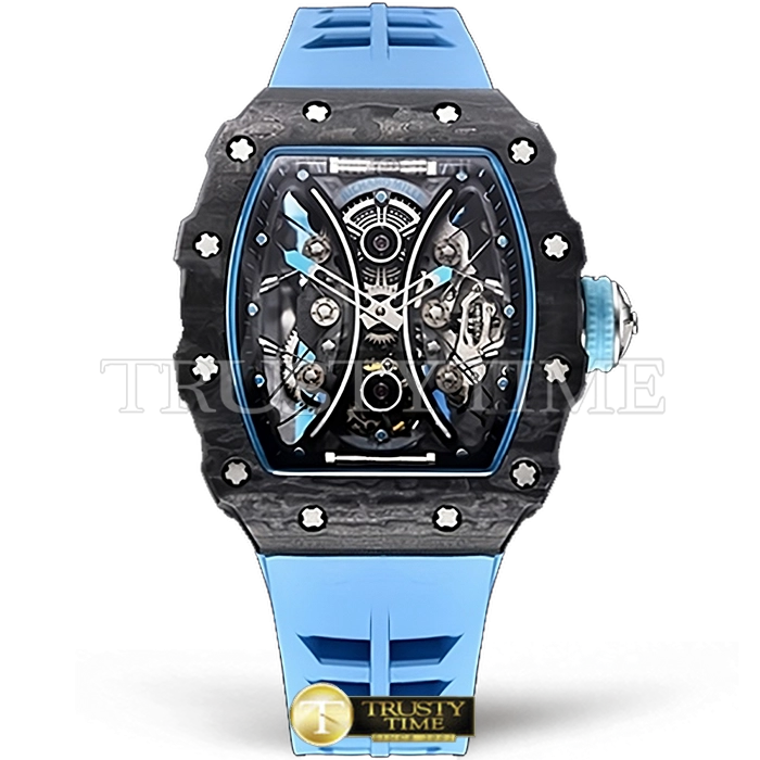 Часы Richard Mille из коллекции RM53. Спортивные мужские часы Richard Mille RM53-01 Pablo Mac Donough Tourbillon премиального качества (Артикул магазина: RM-0431) оснащены надежным автоматическим механизмом с ручным заводом калибра Seagull Handwind Tourbillon, в котором реализованы следующие функции: часова и минутка стрелки, а так же турбийон. Бочкообразный корпус часов черного цвета, имеющий размер 43 мм X 49 мм и высоту 16 мм превосходно дополнит образ и украсит запястье своего обладателя. Для изготовления часов Richard Mille RM53-01 Pablo Mac Donough Tourbillon предлагаемых в нашем интернет-магазине, применяются кованый карбон высокого качества (Швейцарский стандарт), а так же сапфировое стекло высокой прочности, благодаря чему обеспечивается максимальная защита от сколов и механических повреждений. Отличительной чертой данной модели является скелетонизированный циферблат, часовые индексы которого обеспечивают часовые метки. Завершает образ каучуковый ремешок голубого цвета с фирменной раскладывающейся застежкой Richard Mille. Водонепроницаемость данной модели составляет 30М (WR30) – допускается минимальное воздействие с водой.