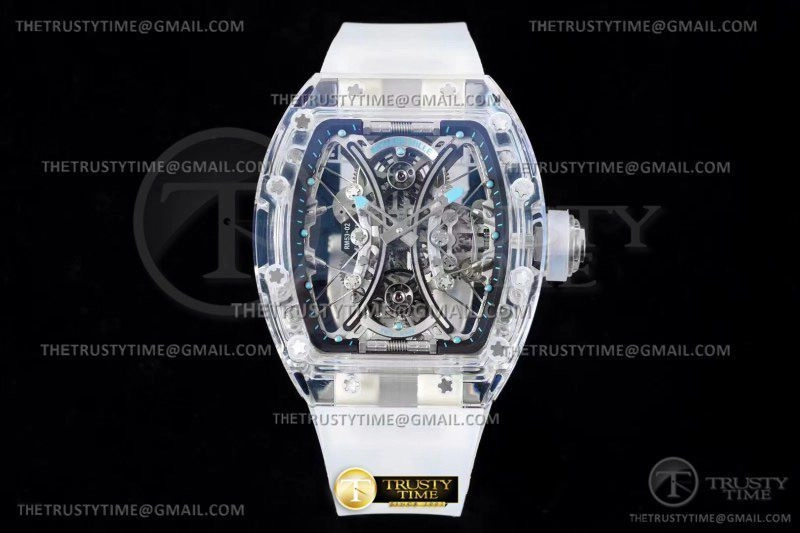 Часы Richard Mille из коллекции RM053. Классические мужские часы Richard Mille RM053-02 Tourbillon Sapphire премиального качества (Артикул магазина: RM-0549) оснащены надежным автоматическим механизмом с ручным заводом калибра Seagull Handwind Tourbillon, в котором реализованы следующие функции: часова и минутка стрелки, а так же турбийон. Бочкообразный корпус часов прозрачного цвета, имеющий размер 43 мм X 49 мм и высоту 16 мм превосходно дополнит образ и украсит запястье своего обладателя. Для изготовления часов Richard Mille RM053-02 Tourbillon Sapphire предлагаемых в нашем интернет-магазине, применяются композитный материал высокого качества (Швейцарский стандарт), а так же сапфировое стекло высокой прочности, благодаря чему обеспечивается максимальная защита от сколов и механических повреждений. Отличительной чертой данной модели является скелетонизированный циферблат, часовые индексы которого обеспечивают часовые метки. Завершает образ каучуковый ремешок белого цвета с фирменной раскладывающейся застежкой Richard Mille. Водонепроницаемость данной модели составляет 30М (WR30) – допускается минимальное воздействие с водой.