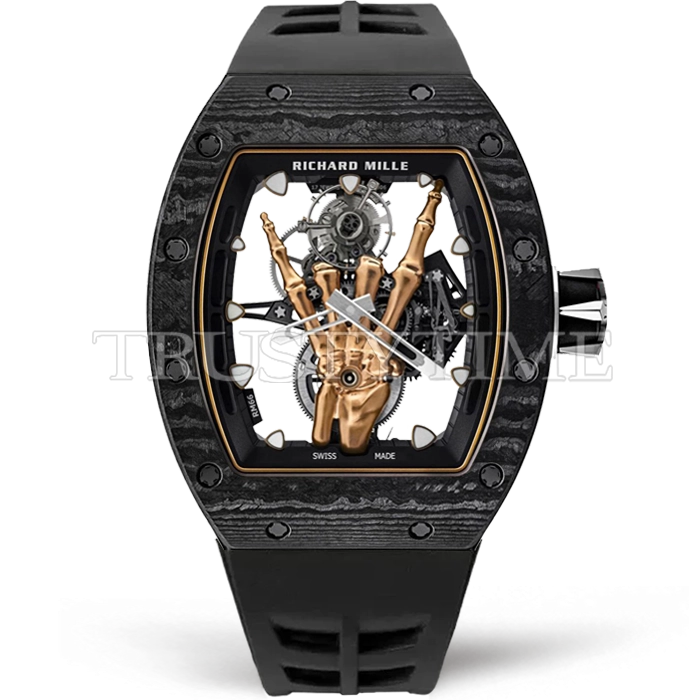 Часы Richard Mille из коллекции RM 66. Классические мужские часы Richard Mille RM 66 Flying Tourbillon премиального качества (Артикул магазина: RM-0589) оснащены надежным автоматическим механизмом с ручным заводом калибра Seagull Handwind Tourbillon, в котором реализованы следующие функции: часова и минутка стрелки, а так же турбийон. Бочкообразный корпус часов черного цвета, имеющий размер 41 мм X 47 мм и высоту 15 мм превосходно дополнит образ и украсит запястье своего обладателя. Для изготовления часов Richard Mille RM 66 Flying Tourbillon предлагаемых в нашем интернет-магазине, применяются карбон NTPT высокого качества (Швейцарский стандарт), а так же сапфировое стекло высокой прочности, благодаря чему обеспечивается максимальная защита от сколов и механических повреждений. Отличительной чертой данной модели является скелетонизированный циферблат, часовые индексы которого обеспечивают часовые метки. Завершает образ каучуковый ремешок черного цвета с фирменной раскладывающейся застежкой Richard Mille. Водонепроницаемость данной модели составляет 30М (WR30) – допускается минимальное воздействие с водой.