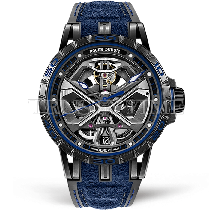 Часы Roger Dubuis из коллекции Excalibur Spider Huracan. Спортивные мужские часы Roger Dubuis Excalibur Spider Huracan Performante RDDBEX0749 премиального качества (Артикул магазина: RG-0457) оснащены надежным автоматическим механизмом с автоподзаводом (работает от амплитуды движения руки) калибра RD630, в котором реализованы следующие функции: часовая, минутная и секундная стрелки, а так же дата. Круглый корпус часов черного цвета, имеющий размер 45 мм и высоту 13.3 мм превосходно дополнит образ и украсит запястье своего обладателя. Для изготовления часов Roger Dubuis Excalibur Spider Huracan Performante RDDBEX0749 предлагаемых в нашем интернет-магазине, применяются титан высокого качества (Швейцарский стандарт), а так же сапфировое стекло высокой прочности, благодаря чему обеспечивается максимальная защита от сколов и механических повреждений. Отличительной чертой данной модели является скелетонизированный циферблат, часовые индексы которого обеспечивают часовые метки. Завершает образ кожаный ремешок синего цвета с фирменной раскладывающейся застежкой Roger Dubuis. Водонепроницаемость данной модели составляет 30М (WR30) – допускается минимальное воздействие с водой.