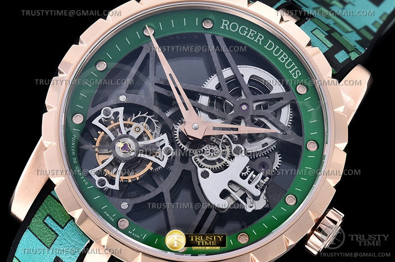 Часы Roger Dubuis из коллекции Excalibur Tourbillon Skeleton. Классические мужские часы Roger Dubuis Excalibur Skeleton Flying Tourbillon премиального качества (Артикул магазина: RG-0448) оснащены надежным автоматическим механизмом с ручным заводом калибра Seagull Handwind Tourbillon, в котором реализованы следующие функции: часова и минутка стрелки, а так же турбийон. Круглый корпус часов розового цвета, имеющий размер 47 мм и высоту 14 мм превосходно дополнит образ и украсит запястье своего обладателя. Для изготовления часов Roger Dubuis Excalibur Skeleton Flying Tourbillon предлагаемых в нашем интернет-магазине, применяются нержавеющая сталь 316L высокого качества (Швейцарский стандарт), а так же сапфировое стекло высокой прочности, благодаря чему обеспечивается максимальная защита от сколов и механических повреждений. Отличительной чертой данной модели является скелетонизированный циферблат, часовые индексы которого обеспечивают часовые метки. Завершает образ кожаный ремешок зеленого цвета с фирменной раскладывающейся застежкой Roger Dubuis. Водонепроницаемость данной модели составляет 30М (WR30) – допускается минимальное воздействие с водой.