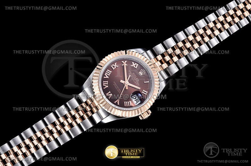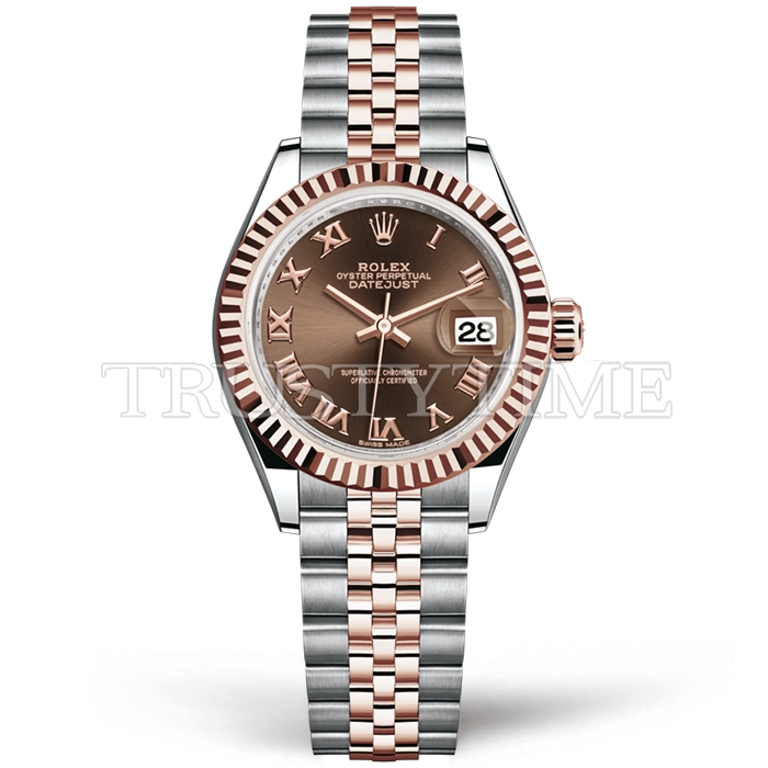 Часы Rolex из коллекции DateJust. Классические женские часы Rolex DateJust 28mm 279171-0009 премиального качества (Артикул магазина: RX-1990) оснащены надежным автоматическим механизмом с автоподзаводом (работает от амплитуды движения руки) калибра ETA2671, в котором реализованы следующие функции: часовая, минутная и секундная стрелки, а так же дата. Круглый корпус часов комбинированного сталь с розового золота цвета, имеющий размер 28 мм и высоту 11 мм превосходно дополнит образ и украсит запястье своего обладателя. Для изготовления часов Rolex DateJust 28mm 279171-0009 предлагаемых в нашем интернет-магазине, применяются нержавеющая сталь 904L высокого качества (Швейцарский стандарт), а так же сапфировое стекло высокой прочности, благодаря чему обеспечивается максимальная защита от сколов и механических повреждений. Отличительной чертой данной модели является коричневый циферблат, часовые индексы которого обеспечивают римские цифры. Завершает образ браслет из нержавеющей стали комбинированного сталь с розовым золотом цвета с фирменной раскладывающейся застежкой Rolex. Водонепроницаемость данной модели составляет 30М (WR30) – допускается минимальное воздействие с водой.