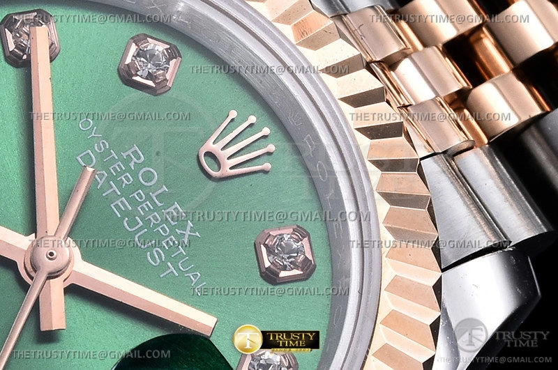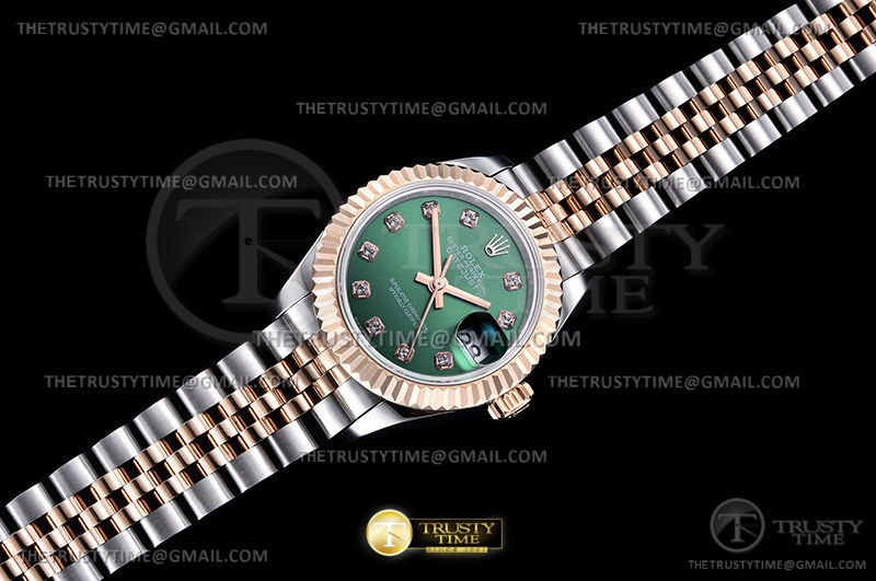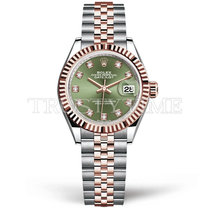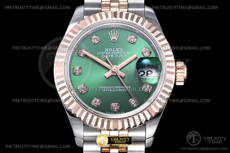 Часы Rolex из коллекции DateJust. Классические женские часы Rolex DateJust 28mm 279171-0007 премиального качества (Артикул магазина: RX-1999) оснащены надежным автоматическим механизмом с автоподзаводом (работает от амплитуды движения руки) калибра ETA2671, в котором реализованы следующие функции: часовая, минутная и секундная стрелки, а так же дата. Круглый корпус часов комбинированного сталь с розового золота цвета, имеющий размер 28 мм и высоту 11 мм превосходно дополнит образ и украсит запястье своего обладателя. Для изготовления часов Rolex DateJust 28mm 279171-0007 предлагаемых в нашем интернет-магазине, применяются нержавеющая сталь 904L высокого качества (Швейцарский стандарт), а так же сапфировое стекло высокой прочности, благодаря чему обеспечивается максимальная защита от сколов и механических повреждений. Отличительной чертой данной модели является зеленый циферблат, часовые индексы которого обеспечивают камни. Завершает образ браслет из нержавеющей стали комбинированного сталь с розовым золотом цвета с фирменной раскладывающейся застежкой Rolex. Водонепроницаемость данной модели составляет 30М (WR30) – допускается минимальное воздействие с водой.