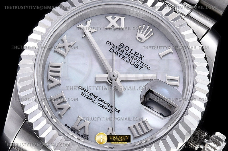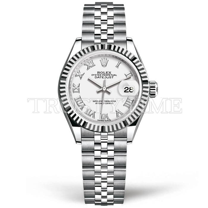Часы Rolex из коллекции DateJust. Классические женские часы Rolex DateJust 28mm 279174-0019 премиального качества (Артикул магазина: RX-2024) оснащены надежным автоматическим механизмом с автоподзаводом (работает от амплитуды движения руки) калибра ETA2671, в котором реализованы следующие функции: часовая, минутная и секундная стрелки, а так же дата. Круглый корпус часов стального цвета, имеющий размер 28 мм и высоту 11 мм превосходно дополнит образ и украсит запястье своего обладателя. Для изготовления часов Rolex DateJust 28mm 279174-0019 предлагаемых в нашем интернет-магазине, применяются нержавеющая сталь 904L высокого качества (Швейцарский стандарт), а так же сапфировое стекло высокой прочности, благодаря чему обеспечивается максимальная защита от сколов и механических повреждений. Отличительной чертой данной модели является белый циферблат, часовые индексы которого обеспечивают римские цифры. Завершает образ браслет из нержавеющей стали стального цвета с фирменной раскладывающейся застежкой Rolex. Водонепроницаемость данной модели составляет 30М (WR30) – допускается минимальное воздействие с водой.