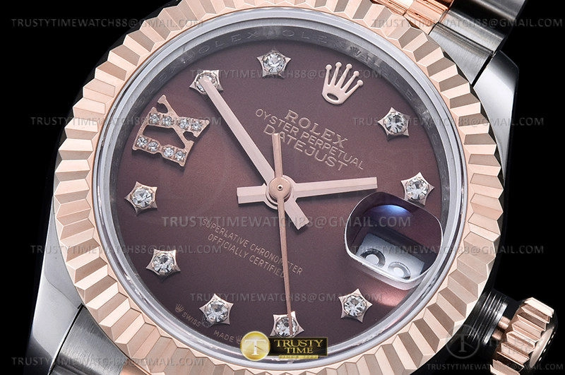 Часы Rolex из коллекции DateJust. Классические женские часы Rolex DateJust 28mm 279171-0003 премиального качества (Артикул магазина: RX-2883) оснащены надежным автоматическим механизмом с автоподзаводом (работает от амплитуды движения руки) калибра ETA2671, в котором реализованы следующие функции: часовая, минутная и секундная стрелки, а так же дата. Круглый корпус часов комбинированного сталь с розового золота цвета, имеющий размер 28 мм и высоту 11 мм превосходно дополнит образ и украсит запястье своего обладателя. Для изготовления часов Rolex DateJust 28mm 279171-0003 предлагаемых в нашем интернет-магазине, применяются нержавеющая сталь 904L высокого качества (Швейцарский стандарт), а так же сапфировое стекло высокой прочности, благодаря чему обеспечивается максимальная защита от сколов и механических повреждений. Отличительной чертой данной модели является коричневый циферблат, часовые индексы которого обеспечивают камни. Завершает образ браслет из нержавеющей стали комбинированного сталь с розовым золотом цвета с фирменной раскладывающейся застежкой Rolex. Водонепроницаемость данной модели составляет 30М (WR30) – допускается минимальное воздействие с водой.