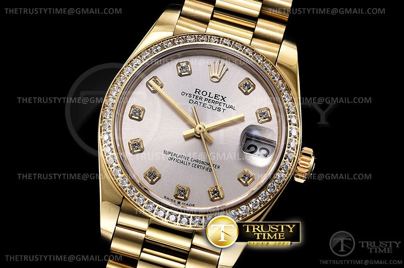 Часы Rolex из коллекции DateJust. Классические женские часы Rolex DateJust 31mm 278288RBR-0028 премиального качества (Артикул магазина: RX-0555) оснащены надежным автоматическим механизмом с автоподзаводом (работает от амплитуды движения руки) калибра ETA2824-2, в котором реализованы следующие функции: часовая, минутная и секундная стрелки, а так же дата. Круглый корпус часов цветы желтой золота, имеющий размер 31 мм и высоту 12 мм превосходно дополнит образ и украсит запястье своего обладателя. Для изготовления часов Rolex DateJust 31mm 278288RBR-0028 предлагаемых в нашем интернет-магазине, применяются нержавеющая сталь 316F высокого качества (Швейцарский стандарт), а так же сапфировое стекло высокой прочности, благодаря чему обеспечивается максимальная защита от сколов и механических повреждений. Отличительной чертой данной модели является серебристый циферблат, часовые индексы которого обеспечивают камни. Завершает образ браслет из нержавеющей стали цвета желтого золота с фирменной раскладывающейся застежкой Rolex. Водонепроницаемость данной модели составляет 30М (WR30) – допускается минимальное воздействие с водой.