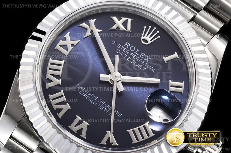 Часы Rolex из коллекции DateJust. Классические женские часы Rolex DateJust 31mm 178279-0083 премиального качества (Артикул магазина: RX-0585) оснащены надежным автоматическим механизмом с автоподзаводом (работает от амплитуды движения руки) калибра ETA2824-2, в котором реализованы следующие функции: часовая, минутная и секундная стрелки, а так же дата. Круглый корпус часов стального цвета, имеющий размер 31 мм и высоту 12 мм превосходно дополнит образ и украсит запястье своего обладателя. Для изготовления часов Rolex DateJust 31mm 178279-0083 предлагаемых в нашем интернет-магазине, применяются нержавеющая сталь 316F высокого качества (Швейцарский стандарт), а так же сапфировое стекло высокой прочности, благодаря чему обеспечивается максимальная защита от сколов и механических повреждений. Отличительной чертой данной модели является синий циферблат, часовые индексы которого обеспечивают римские цифры. Завершает образ браслет из нержавеющей стали стального цвета с фирменной раскладывающейся застежкой Rolex. Водонепроницаемость данной модели составляет 30М (WR30) – допускается минимальное воздействие с водой.