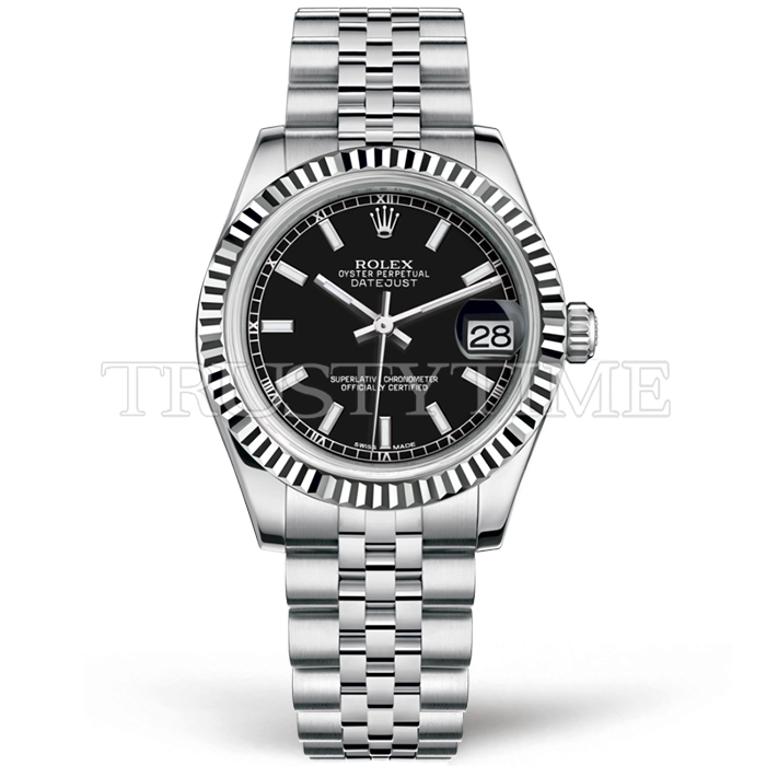 Часы Rolex из коллекции DateJust. Классические женские часы Rolex DateJust 31mm 178274-0004 премиального качества (Артикул магазина: RX-0577) оснащены надежным автоматическим механизмом с автоподзаводом (работает от амплитуды движения руки) калибра ETA2824-2, в котором реализованы следующие функции: часовая, минутная и секундная стрелки, а так же дата. Круглый корпус часов стального цвета, имеющий размер 31 мм и высоту 12 мм превосходно дополнит образ и украсит запястье своего обладателя. Для изготовления часов Rolex DateJust 31mm 178274-0004 предлагаемых в нашем интернет-магазине, применяются нержавеющая сталь 904L высокого качества (Швейцарский стандарт), а так же сапфировое стекло высокой прочности, благодаря чему обеспечивается максимальная защита от сколов и механических повреждений. Отличительной чертой данной модели является черный циферблат, часовые индексы которого обеспечивают часовые метки. Завершает образ браслет из нержавеющей стали стального цвета с фирменной раскладывающейся застежкой Rolex. Водонепроницаемость данной модели составляет 30М (WR30) – допускается минимальное воздействие с водой.