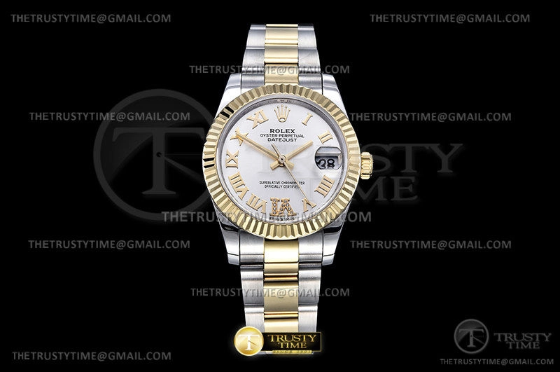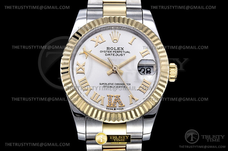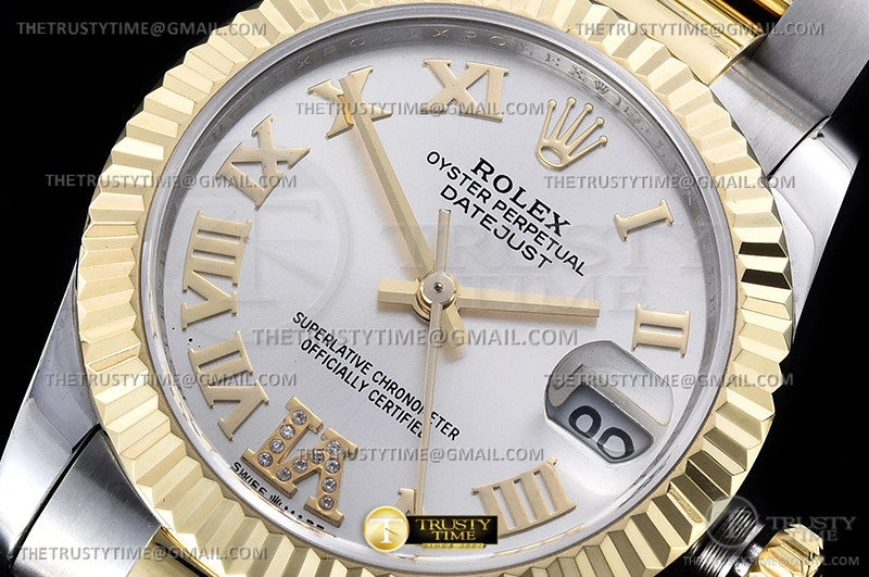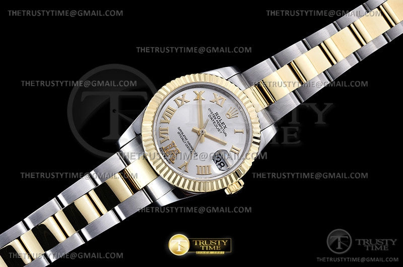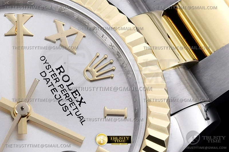 Часы Rolex из коллекции DateJust. Классические женские часы Rolex DateJust 31mm 278273-0003 премиального качества (Артикул магазина: RX-1892) оснащены надежным автоматическим механизмом с автоподзаводом (работает от амплитуды движения руки) калибра ETA2824-2, в котором реализованы следующие функции: часовая, минутная и секундная стрелки, а так же дата. Круглый корпус часов комбинированного сталь с желтого золота цвета, имеющий размер 31 мм и высоту 12 мм превосходно дополнит образ и украсит запястье своего обладателя. Для изготовления часов Rolex DateJust 31mm 278273-0003 предлагаемых в нашем интернет-магазине, применяются нержавеющая сталь 316F высокого качества (Швейцарский стандарт), а так же сапфировое стекло высокой прочности, благодаря чему обеспечивается максимальная защита от сколов и механических повреждений. Отличительной чертой данной модели является серебристый циферблат, часовые индексы которого обеспечивают римские цифры. Завершает образ браслет из нержавеющей стали комбинированного сталь с желтым золотом цвета с фирменной раскладывающейся застежкой Rolex. Водонепроницаемость данной модели составляет 30М (WR30) – допускается минимальное воздействие с водой.