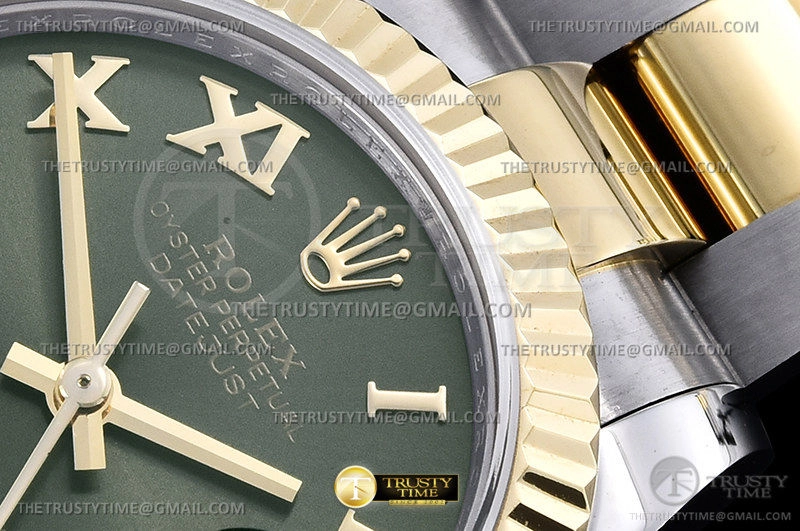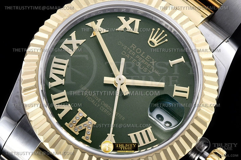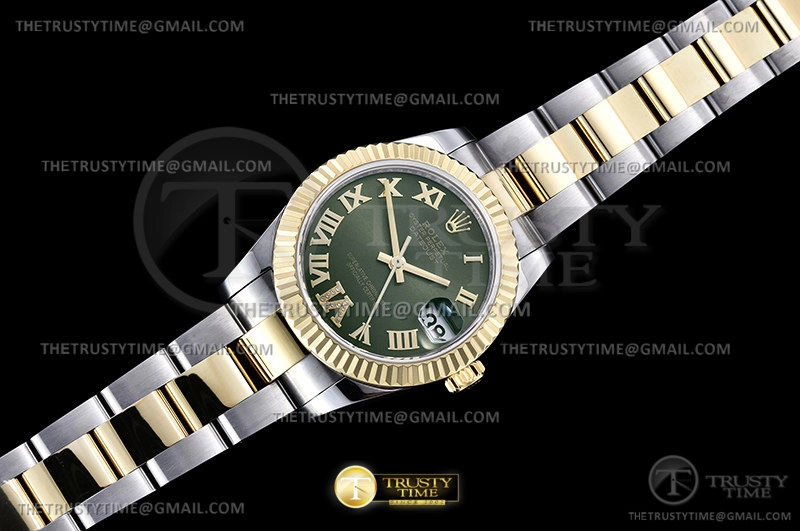 Часы Rolex из коллекции DateJust. Классические женские часы Rolex DateJust 31mm 278273-0015 премиального качества (Артикул магазина: RX-1894) оснащены надежным автоматическим механизмом с автоподзаводом (работает от амплитуды движения руки) калибра ETA2824-2, в котором реализованы следующие функции: часовая, минутная и секундная стрелки, а так же дата. Круглый корпус часов комбинированного сталь с желтого золота цвета, имеющий размер 31 мм и высоту 12 мм превосходно дополнит образ и украсит запястье своего обладателя. Для изготовления часов Rolex DateJust 31mm 278273-0015 предлагаемых в нашем интернет-магазине, применяются нержавеющая сталь 316F высокого качества (Швейцарский стандарт), а так же сапфировое стекло высокой прочности, благодаря чему обеспечивается максимальная защита от сколов и механических повреждений. Отличительной чертой данной модели является зеленый циферблат, часовые индексы которого обеспечивают римские цифры. Завершает образ браслет из нержавеющей стали комбинированного сталь с желтым золотом цвета с фирменной раскладывающейся застежкой Rolex. Водонепроницаемость данной модели составляет 30М (WR30) – допускается минимальное воздействие с водой.