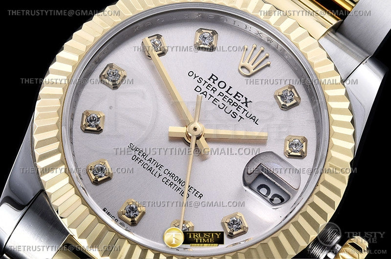 Часы Rolex из коллекции DateJust. Классические женские часы Rolex DateJust 31mm 278273-0019 премиального качества (Артикул магазина: RX-1900) оснащены надежным автоматическим механизмом с автоподзаводом (работает от амплитуды движения руки) калибра ETA2824-2, в котором реализованы следующие функции: часовая, минутная и секундная стрелки, а так же дата. Круглый корпус часов комбинированного сталь с желтого золота цвета, имеющий размер 31 мм и высоту 12 мм превосходно дополнит образ и украсит запястье своего обладателя. Для изготовления часов Rolex DateJust 31mm 278273-0019 предлагаемых в нашем интернет-магазине, применяются нержавеющая сталь 316F высокого качества (Швейцарский стандарт), а так же сапфировое стекло высокой прочности, благодаря чему обеспечивается максимальная защита от сколов и механических повреждений. Отличительной чертой данной модели является серебристый циферблат, часовые индексы которого обеспечивают камни. Завершает образ браслет из нержавеющей стали комбинированного сталь с желтым золотом цвета с фирменной раскладывающейся застежкой Rolex. Водонепроницаемость данной модели составляет 30М (WR30) – допускается минимальное воздействие с водой.