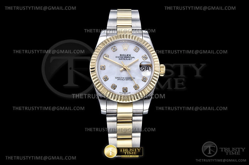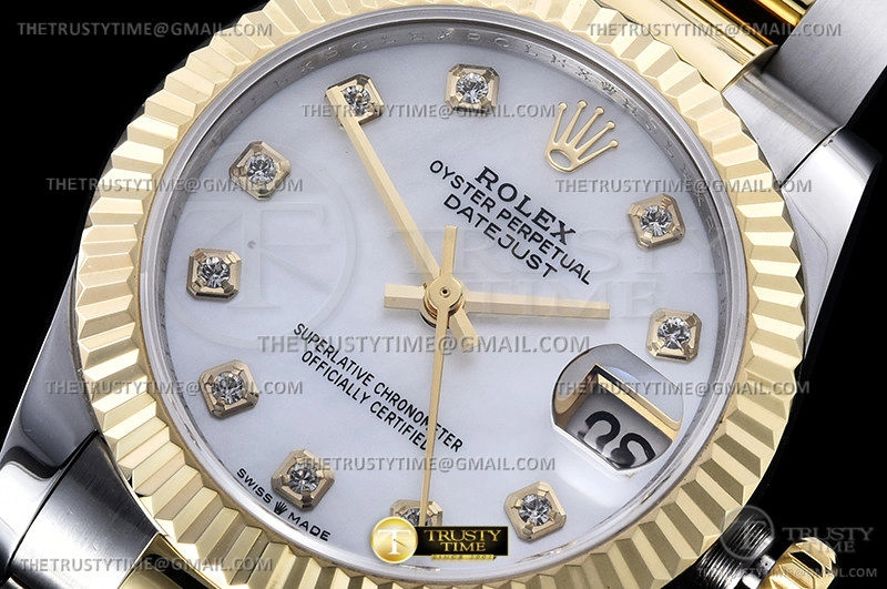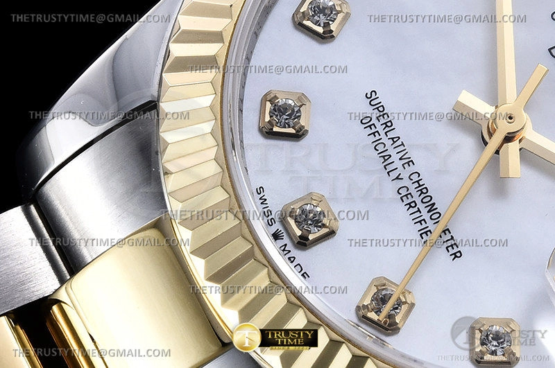 Часы Rolex из коллекции DateJust. Классические женские часы Rolex DateJust 31mm 278273-0027 премиального качества (Артикул магазина: RX-1903) оснащены надежным автоматическим механизмом с автоподзаводом (работает от амплитуды движения руки) калибра ETA2824-2, в котором реализованы следующие функции: часовая, минутная и секундная стрелки, а так же дата. Круглый корпус часов комбинированного сталь с желтого золота цвета, имеющий размер 31 мм и высоту 12 мм превосходно дополнит образ и украсит запястье своего обладателя. Для изготовления часов Rolex DateJust 31mm 278273-0027 предлагаемых в нашем интернет-магазине, применяются нержавеющая сталь 316F высокого качества (Швейцарский стандарт), а так же сапфировое стекло высокой прочности, благодаря чему обеспечивается максимальная защита от сколов и механических повреждений. Отличительной чертой данной модели является перламутровый циферблат, часовые индексы которого обеспечивают камни. Завершает образ браслет из нержавеющей стали комбинированного сталь с желтым золотом цвета с фирменной раскладывающейся застежкой Rolex. Водонепроницаемость данной модели составляет 30М (WR30) – допускается минимальное воздействие с водой.