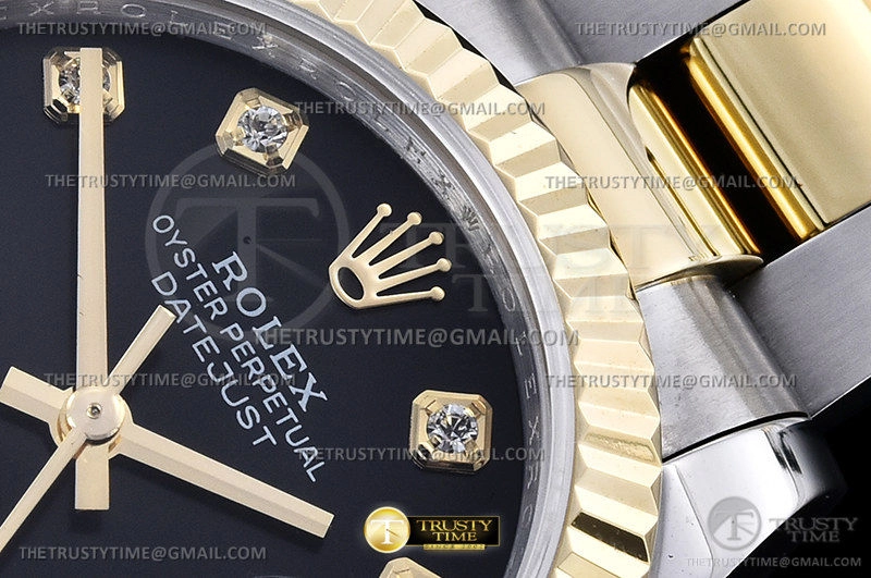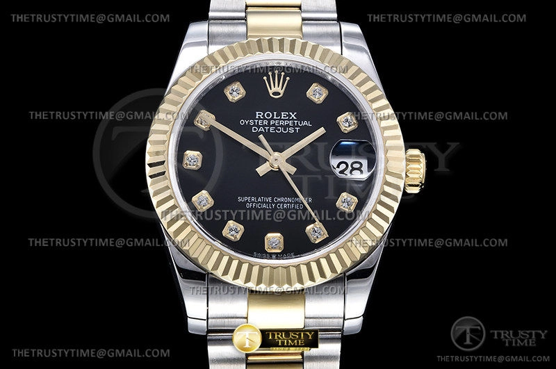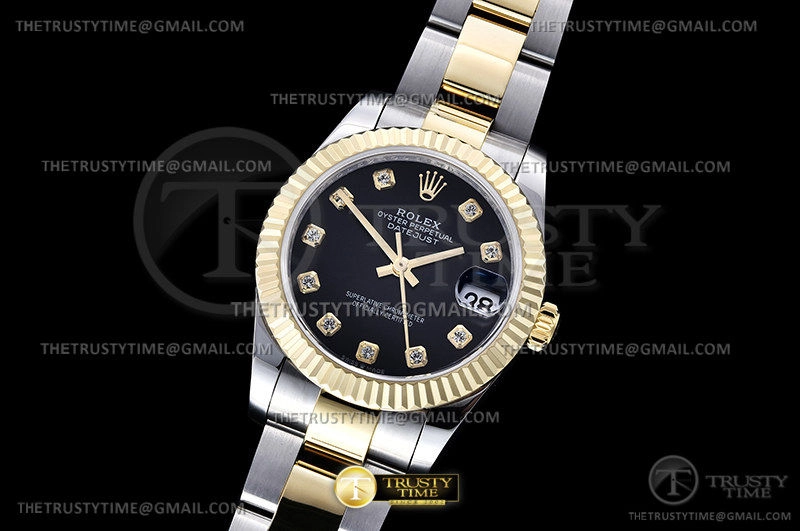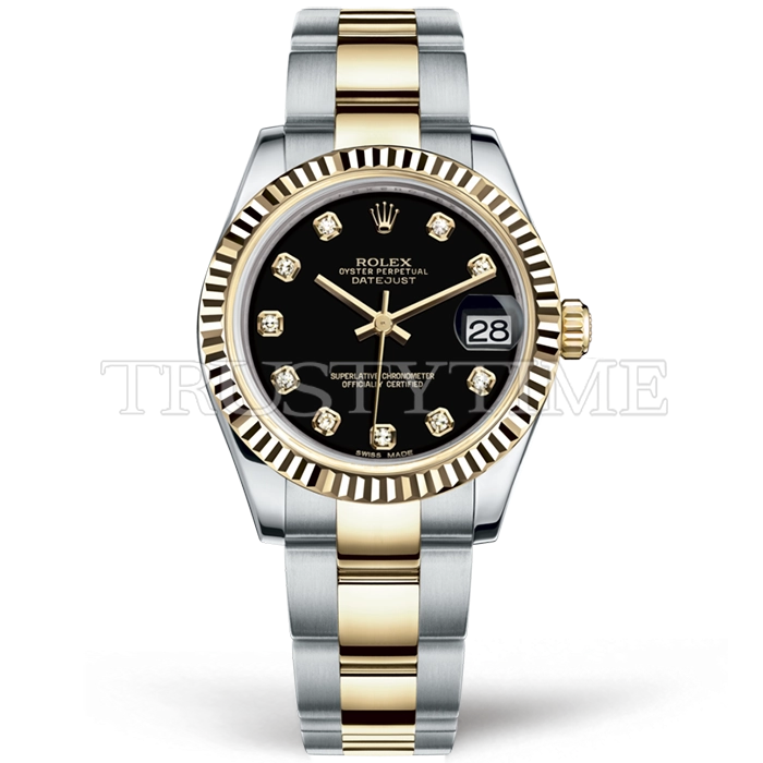 Часы Rolex из коллекции DateJust. Классические женские часы Rolex DateJust 31mm 178273-0045 премиального качества (Артикул магазина: RX-1906) оснащены надежным автоматическим механизмом с автоподзаводом (работает от амплитуды движения руки) калибра ETA2824-2, в котором реализованы следующие функции: часовая, минутная и секундная стрелки, а так же дата. Круглый корпус часов комбинированного сталь с желтого золота цвета, имеющий размер 31 мм и высоту 12 мм превосходно дополнит образ и украсит запястье своего обладателя. Для изготовления часов Rolex DateJust 31mm 178273-0045 предлагаемых в нашем интернет-магазине, применяются нержавеющая сталь 316F высокого качества (Швейцарский стандарт), а так же сапфировое стекло высокой прочности, благодаря чему обеспечивается максимальная защита от сколов и механических повреждений. Отличительной чертой данной модели является черный циферблат, часовые индексы которого обеспечивают камни. Завершает образ браслет из нержавеющей стали комбинированного сталь с желтым золотом цвета с фирменной раскладывающейся застежкой Rolex. Водонепроницаемость данной модели составляет 30М (WR30) – допускается минимальное воздействие с водой.