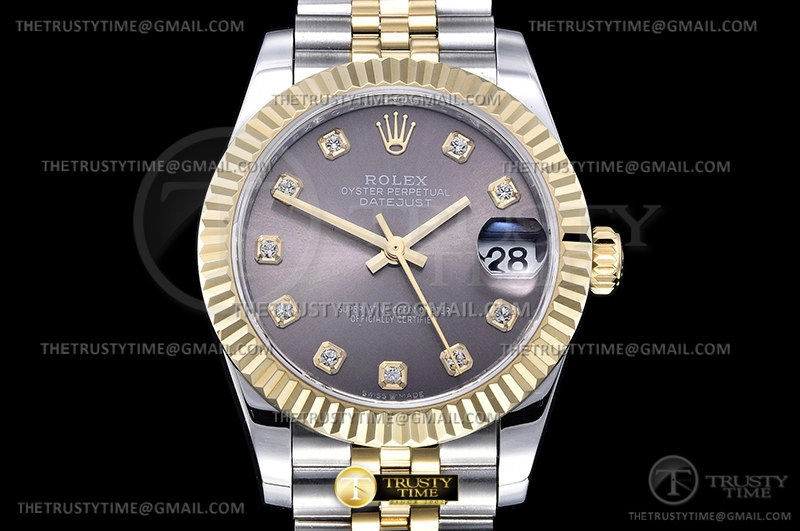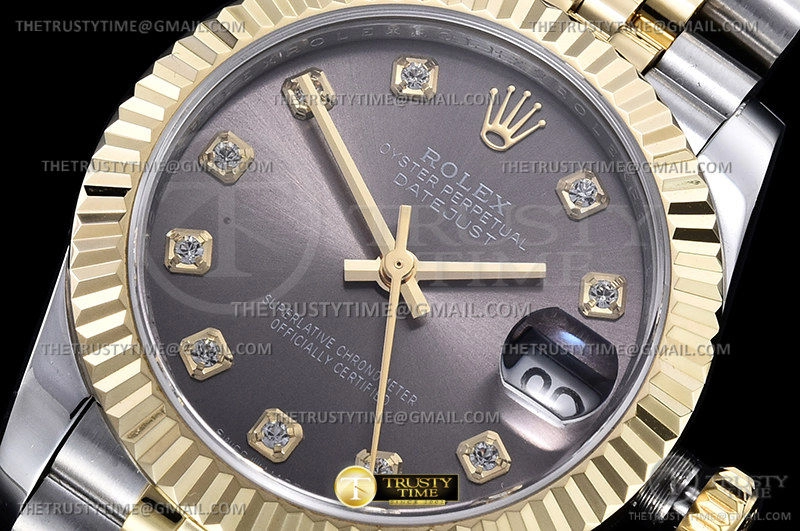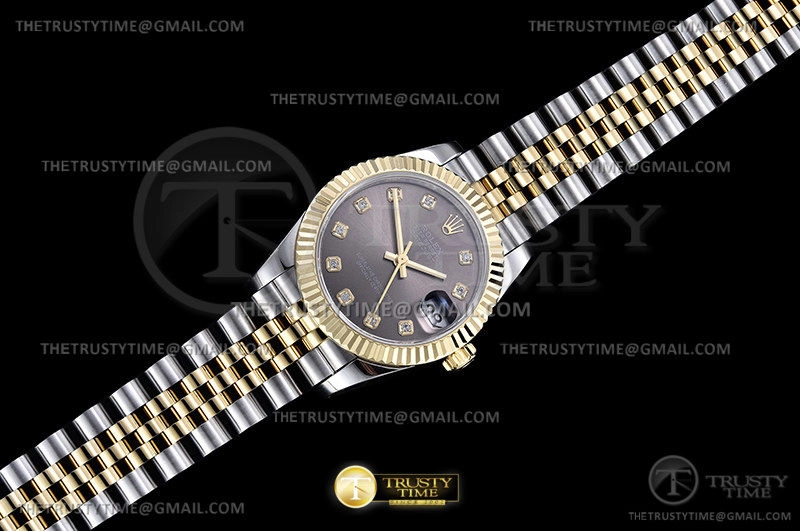 Часы Rolex из коллекции DateJust. Классические женские часы Rolex DateJust 31mm 278273-0022 премиального качества (Артикул магазина: RX-2066) оснащены надежным автоматическим механизмом с автоподзаводом (работает от амплитуды движения руки) калибра ETA2836-2, в котором реализованы следующие функции: часовая, минутная и секундная стрелки, а так же дата. Круглый корпус часов комбинированного сталь с желтого золота цвета, имеющий размер 31 мм и высоту 12 мм превосходно дополнит образ и украсит запястье своего обладателя. Для изготовления часов Rolex DateJust 31mm 278273-0022 предлагаемых в нашем интернет-магазине, применяются нержавеющая сталь 316F высокого качества (Швейцарский стандарт), а так же сапфировое стекло высокой прочности, благодаря чему обеспечивается максимальная защита от сколов и механических повреждений. Отличительной чертой данной модели является серый циферблат, часовые индексы которого обеспечивают камни. Завершает образ браслет из нержавеющей стали комбинированного сталь с желтым золотом цвета с фирменной раскладывающейся застежкой Rolex. Водонепроницаемость данной модели составляет 30М (WR30) – допускается минимальное воздействие с водой.