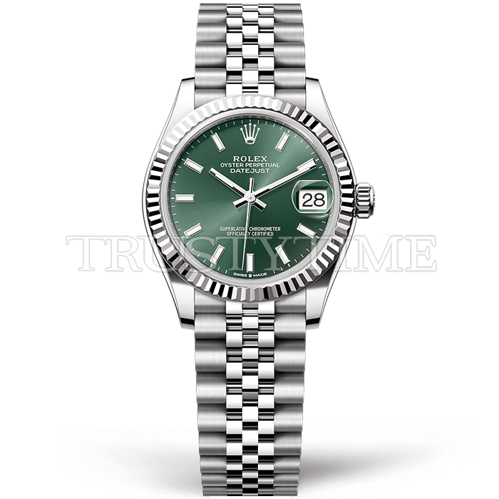 Часы Rolex из коллекции DateJust. Классические женские часы Rolex DateJust 31mm 278274-0018 премиального качества (Артикул магазина: RX-2112) оснащены надежным автоматическим механизмом с автоподзаводом (работает от амплитуды движения руки) калибра ETA2688, в котором реализованы следующие функции: часовая, минутная и секундная стрелки, а так же дата. Круглый корпус часов стального цвета, имеющий размер 31 мм и высоту 12 мм превосходно дополнит образ и украсит запястье своего обладателя. Для изготовления часов Rolex DateJust 31mm 278274-0018 предлагаемых в нашем интернет-магазине, применяются нержавеющая сталь 904L высокого качества (Швейцарский стандарт), а так же сапфировое стекло высокой прочности, благодаря чему обеспечивается максимальная защита от сколов и механических повреждений. Отличительной чертой данной модели является зеленый циферблат, часовые индексы которого обеспечивают часовые метки. Завершает образ браслет из нержавеющей стали стального цвета с фирменной раскладывающейся застежкой Rolex. Водонепроницаемость данной модели составляет 30М (WR30) – допускается минимальное воздействие с водой.