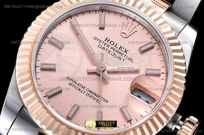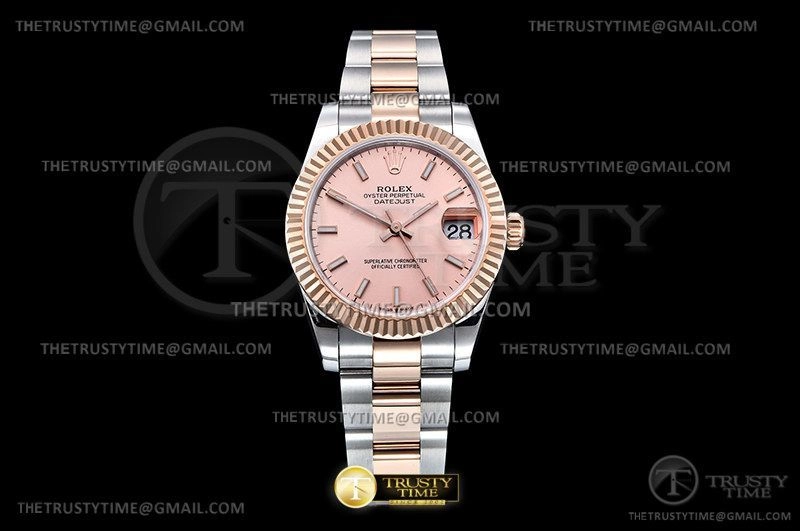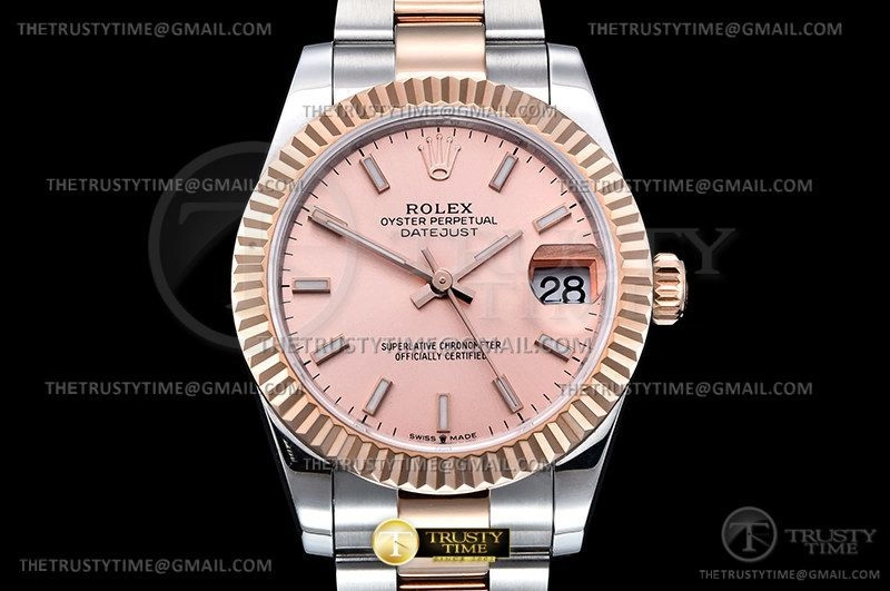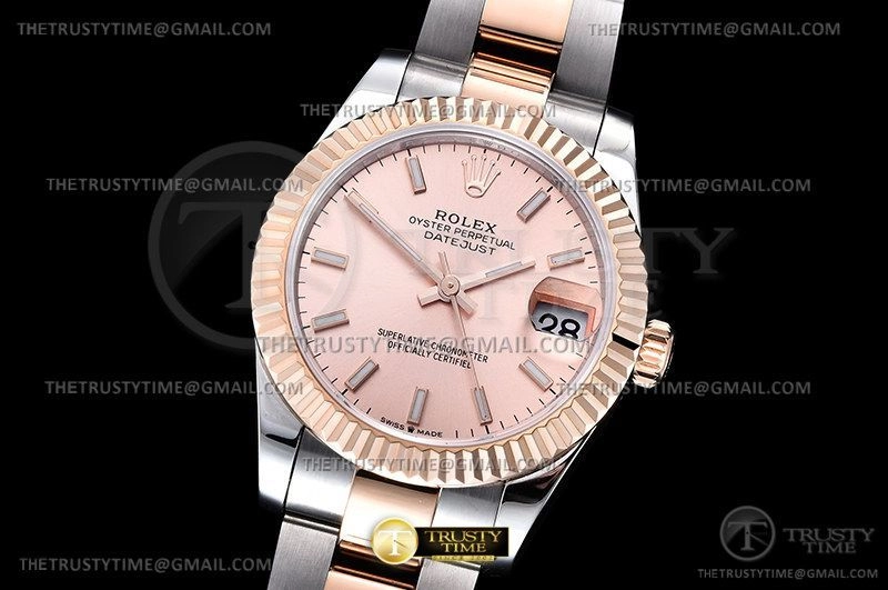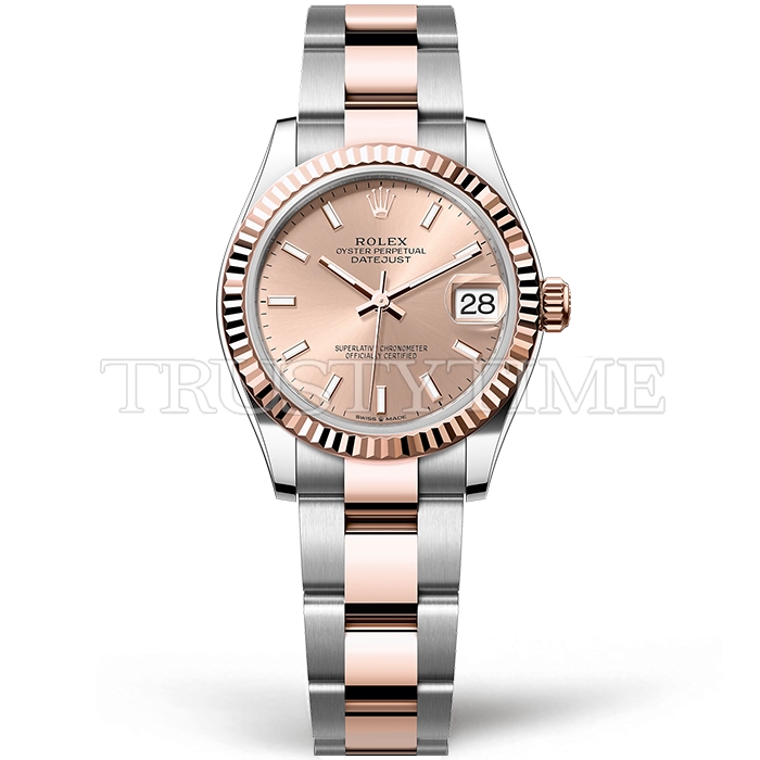 Часы Rolex из коллекции DateJust. Классические женские часы Rolex DateJust 31mm 278271-0009 премиального качества (Артикул магазина: RX-2278) оснащены надежным автоматическим механизмом с автоподзаводом (работает от амплитуды движения руки) калибра ETA2824-2, в котором реализованы следующие функции: часовая, минутная и секундная стрелки, а так же дата. Круглый корпус часов комбинированного сталь с розового золота цвета, имеющий размер 31 мм и высоту 12 мм превосходно дополнит образ и украсит запястье своего обладателя. Для изготовления часов Rolex DateJust 31mm 278271-0009 предлагаемых в нашем интернет-магазине, применяются нержавеющая сталь 904L высокого качества (Швейцарский стандарт), а так же сапфировое стекло высокой прочности, благодаря чему обеспечивается максимальная защита от сколов и механических повреждений. Отличительной чертой данной модели является розовый циферблат, часовые индексы которого обеспечивают часовые метки. Завершает образ браслет из нержавеющей стали комбинированного сталь с розовым золотом цвета с фирменной раскладывающейся застежкой Rolex. Водонепроницаемость данной модели составляет 30М (WR30) – допускается минимальное воздействие с водой.