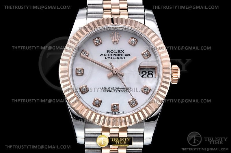 Часы Rolex из коллекции DateJust. Классические женские часы Rolex DateJust 31mm 178271-0010 премиального качества (Артикул магазина: RX-2290) оснащены надежным автоматическим механизмом с автоподзаводом (работает от амплитуды движения руки) калибра ETA2824-2, в котором реализованы следующие функции: часовая, минутная и секундная стрелки, а так же дата. Круглый корпус часов комбинированного сталь с розового золота цвета, имеющий размер 31 мм и высоту 12 мм превосходно дополнит образ и украсит запястье своего обладателя. Для изготовления часов Rolex DateJust 31mm 178271-0010 предлагаемых в нашем интернет-магазине, применяются нержавеющая сталь 904L высокого качества (Швейцарский стандарт), а так же сапфировое стекло высокой прочности, благодаря чему обеспечивается максимальная защита от сколов и механических повреждений. Отличительной чертой данной модели является белый циферблат, часовые индексы которого обеспечивают камни. Завершает образ браслет из нержавеющей стали комбинированного сталь с розовым золотом цвета с фирменной раскладывающейся застежкой Rolex. Водонепроницаемость данной модели составляет 30М (WR30) – допускается минимальное воздействие с водой.
