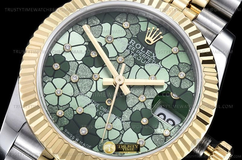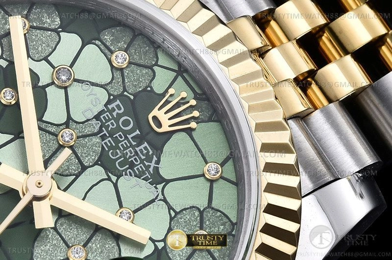 Часы Rolex из коллекции DateJust. Классические женские часы Rolex DateJust 31mm 278273-0032 премиального качества (Артикул магазина: RX-2860) оснащены надежным автоматическим механизмом с автоподзаводом (работает от амплитуды движения руки) калибра ETA2824-2, в котором реализованы следующие функции: часовая, минутная и секундная стрелки, а так же дата. Круглый корпус часов комбинированного сталь с желтого золота цвета, имеющий размер 31 мм и высоту 12 мм превосходно дополнит образ и украсит запястье своего обладателя. Для изготовления часов Rolex DateJust 31mm 278273-0032 предлагаемых в нашем интернет-магазине, применяются нержавеющая сталь 316F высокого качества (Швейцарский стандарт), а так же сапфировое стекло высокой прочности, благодаря чему обеспечивается максимальная защита от сколов и механических повреждений. Отличительной чертой данной модели является зеленый циферблат, без меток и цифр. Завершает образ браслет из нержавеющей стали комбинированного сталь с желтым золотом цвета с фирменной раскладывающейся застежкой Rolex. Водонепроницаемость данной модели составляет 30М (WR30) – допускается минимальное воздействие с водой.