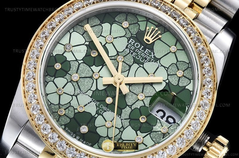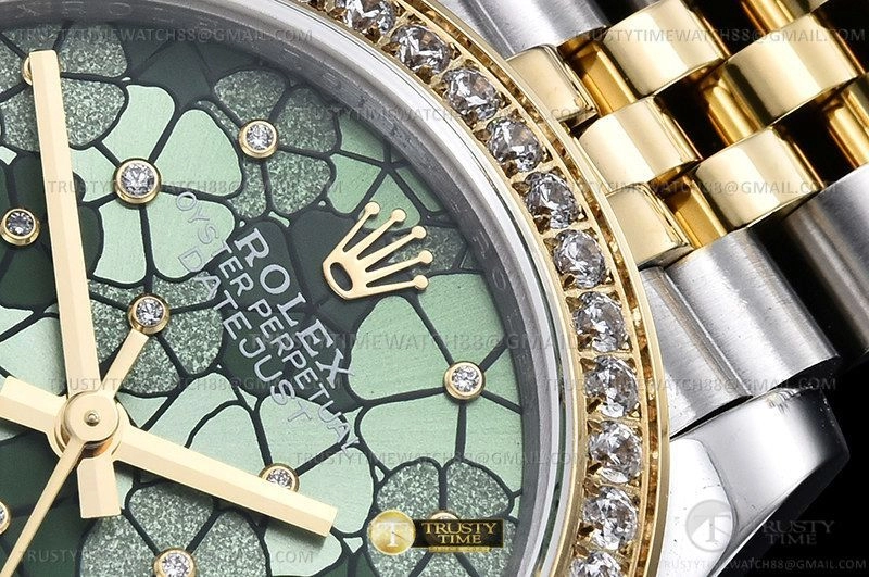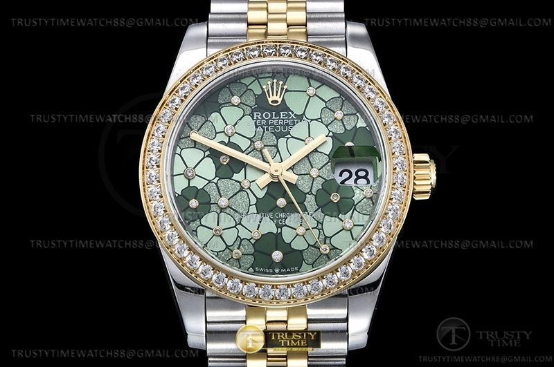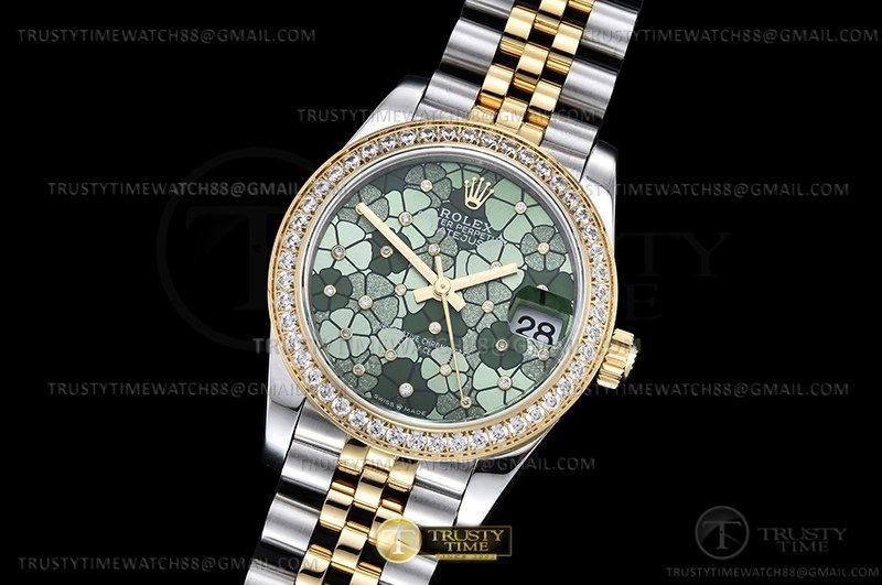 Часы Rolex из коллекции DateJust. Классические женские часы Rolex DateJust 31mm 278383RBR-0032 премиального качества (Артикул магазина: RX-2863) оснащены надежным автоматическим механизмом с автоподзаводом (работает от амплитуды движения руки) калибра ETA2824-2, в котором реализованы следующие функции: часовая, минутная и секундная стрелки, а так же дата. Круглый корпус часов комбинированного сталь с желтого золота цвета, имеющий размер 31 мм и высоту 12 мм превосходно дополнит образ и украсит запястье своего обладателя. Для изготовления часов Rolex DateJust 31mm 278383RBR-0032 предлагаемых в нашем интернет-магазине, применяются нержавеющая сталь 316F высокого качества (Швейцарский стандарт), а так же сапфировое стекло высокой прочности, благодаря чему обеспечивается максимальная защита от сколов и механических повреждений. Отличительной чертой данной модели является зеленый циферблат, без меток и цифр. Завершает образ браслет из нержавеющей стали комбинированного сталь с желтым золотом цвета с фирменной раскладывающейся застежкой Rolex. Водонепроницаемость данной модели составляет 30М (WR30) – допускается минимальное воздействие с водой.