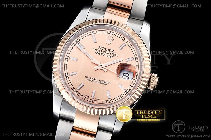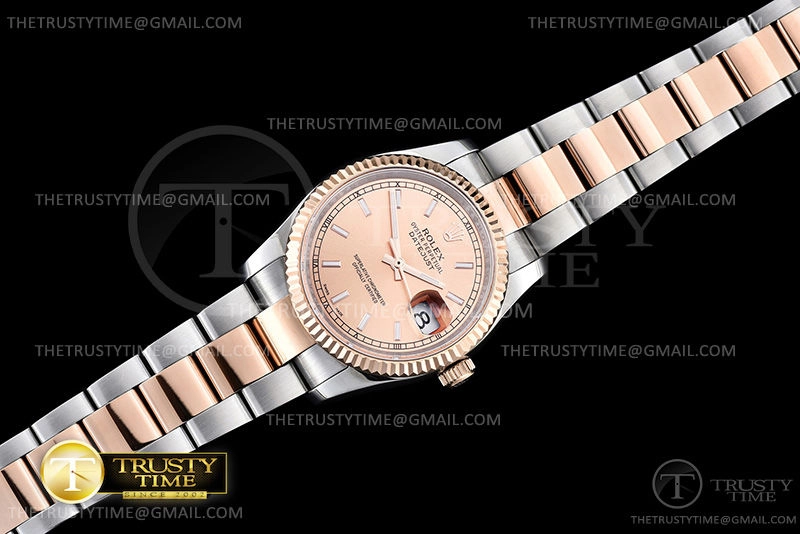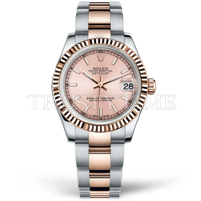 Часы Rolex из коллекции DateJust. Классические женские часы Rolex DateJust 31mm 178271-0001 премиального качества (Артикул магазина: RX-0573) оснащены надежным автоматическим механизмом с автоподзаводом (работает от амплитуды движения руки) калибра ETA2836-2, в котором реализованы следующие функции: часовая, минутная и секундная стрелки, а так же дата. Круглый корпус часов комбинированного сталь с розового золота цвета, имеющий размер 31 мм и высоту 11 мм превосходно дополнит образ и украсит запястье своего обладателя. Для изготовления часов Rolex DateJust 31mm 178271-0001 предлагаемых в нашем интернет-магазине, применяются нержавеющая сталь 316L высокого качества (Швейцарский стандарт), а так же сапфировое стекло высокой прочности, благодаря чему обеспечивается максимальная защита от сколов и механических повреждений. Отличительной чертой данной модели является розовый циферблат, часовые индексы которого обеспечивают часовые метки. Завершает образ браслет из нержавеющей стали комбинированного сталь с розовым золотом цвета с фирменной раскладывающейся застежкой Rolex. Водонепроницаемость данной модели составляет 30М (WR30) – допускается минимальное воздействие с водой.