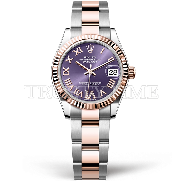 Часы Rolex из коллекции DateJust. Классические женские часы Rolex DateJust 31mm 278271-0019 премиального качества (Артикул магазина: RX-1896) оснащены надежным автоматическим механизмом с автоподзаводом (работает от амплитуды движения руки) калибра ETA2824-2, в котором реализованы следующие функции: часовая, минутная и секундная стрелки, а так же дата. Круглый корпус часов комбинированного сталь с розового золота цвета, имеющий размер 31 мм и высоту 12 мм превосходно дополнит образ и украсит запястье своего обладателя. Для изготовления часов Rolex DateJust 31mm 278271-0019 предлагаемых в нашем интернет-магазине, применяются нержавеющая сталь 316F высокого качества (Швейцарский стандарт), а так же сапфировое стекло высокой прочности, благодаря чему обеспечивается максимальная защита от сколов и механических повреждений. Отличительной чертой данной модели является фиолетовый циферблат, часовые индексы которого обеспечивают римские цифры. Завершает образ браслет из нержавеющей стали комбинированного сталь с розовым золотом цвета с фирменной раскладывающейся застежкой Rolex. Водонепроницаемость данной модели составляет 30М (WR30) – допускается минимальное воздействие с водой.