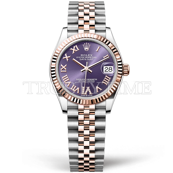 Часы Rolex из коллекции DateJust. Классические женские часы Rolex DateJust 31mm 278271-0020 премиального качества (Артикул магазина: RX-2052) оснащены надежным автоматическим механизмом с автоподзаводом (работает от амплитуды движения руки) калибра ETA2836-2, в котором реализованы следующие функции: часовая, минутная и секундная стрелки, а так же дата. Круглый корпус часов комбинированного сталь с розового золота цвета, имеющий размер 31 мм и высоту 12 мм превосходно дополнит образ и украсит запястье своего обладателя. Для изготовления часов Rolex DateJust 31mm 278271-0020 предлагаемых в нашем интернет-магазине, применяются нержавеющая сталь 316F высокого качества (Швейцарский стандарт), а так же сапфировое стекло высокой прочности, благодаря чему обеспечивается максимальная защита от сколов и механических повреждений. Отличительной чертой данной модели является фиолетовый циферблат, часовые индексы которого обеспечивают римские цифры. Завершает образ браслет из нержавеющей стали комбинированного сталь с розовым золотом цвета с фирменной раскладывающейся застежкой Rolex. Водонепроницаемость данной модели составляет 30М (WR30) – допускается минимальное воздействие с водой.