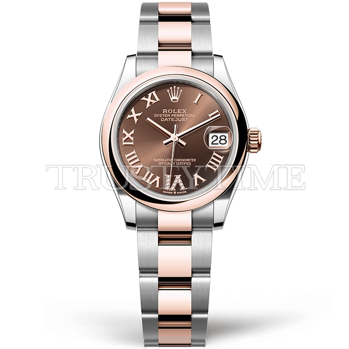 Часы Rolex из коллекции DateJust. Классические женские часы Rolex DateJust 31mm 278241-0003 премиального качества (Артикул магазина: RX-3115) оснащены надежным автоматическим механизмом с автоподзаводом (работает от амплитуды движения руки) калибра ETA2824-2, в котором реализованы следующие функции: часовая, минутная и секундная стрелки, а так же дата. Круглый корпус часов комбинированного сталь с розового золота цвета, имеющий размер 31 мм и высоту 12 мм превосходно дополнит образ и украсит запястье своего обладателя. Для изготовления часов Rolex DateJust 31mm 278241-0003 предлагаемых в нашем интернет-магазине, применяются нержавеющая сталь 904L высокого качества (Швейцарский стандарт), а так же сапфировое стекло высокой прочности, благодаря чему обеспечивается максимальная защита от сколов и механических повреждений. Отличительной чертой данной модели является коричневый циферблат, часовые индексы которого обеспечивают римские цифры. Завершает образ браслет из нержавеющей стали комбинированного сталь с розовым золотом цвета с фирменной раскладывающейся застежкой Rolex. Водонепроницаемость данной модели составляет 30М (WR30) – допускается минимальное воздействие с водой.
