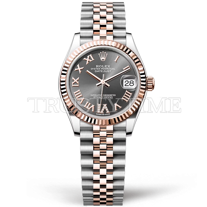 Часы Rolex из коллекции DateJust. Классические женские часы Rolex DateJust 31mm 278271-0030 премиального качества (Артикул магазина: RX-3138) оснащены надежным автоматическим механизмом с автоподзаводом (работает от амплитуды движения руки) калибра ETA2824-2, в котором реализованы следующие функции: часовая, минутная и секундная стрелки, а так же дата. Круглый корпус часов комбинированного сталь с розового золота цвета, имеющий размер 31 мм и высоту 12 мм превосходно дополнит образ и украсит запястье своего обладателя. Для изготовления часов Rolex DateJust 31mm 278271-0030 предлагаемых в нашем интернет-магазине, применяются нержавеющая сталь 904L высокого качества (Швейцарский стандарт), а так же сапфировое стекло высокой прочности, благодаря чему обеспечивается максимальная защита от сколов и механических повреждений. Отличительной чертой данной модели является серый циферблат, часовые индексы которого обеспечивают римские цифры. Завершает образ браслет из нержавеющей стали комбинированного сталь с розовым золотом цвета с фирменной раскладывающейся застежкой Rolex. Водонепроницаемость данной модели составляет 30М (WR30) – допускается минимальное воздействие с водой.