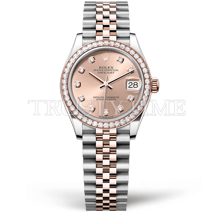 Часы Rolex из коллекции DateJust. Классические женские часы Rolex DateJust 31mm 278381RBR-0024 премиального качества (Артикул магазина: RX-3180) оснащены надежным автоматическим механизмом с автоподзаводом (работает от амплитуды движения руки) калибра ETA2824-2, в котором реализованы следующие функции: часовая, минутная и секундная стрелки, а так же дата. Круглый корпус часов комбинированного сталь с розового золота цвета, имеющий размер 31 мм и высоту 12 мм превосходно дополнит образ и украсит запястье своего обладателя. Для изготовления часов Rolex DateJust 31mm 278381RBR-0024 предлагаемых в нашем интернет-магазине, применяются нержавеющая сталь 904L высокого качества (Швейцарский стандарт), а так же сапфировое стекло высокой прочности, благодаря чему обеспечивается максимальная защита от сколов и механических повреждений. Отличительной чертой данной модели является розовый циферблат, часовые индексы которого обеспечивают камни. Завершает образ браслет из нержавеющей стали комбинированного сталь с розовым золотом цвета с фирменной раскладывающейся застежкой Rolex. Водонепроницаемость данной модели составляет 30М (WR30) – допускается минимальное воздействие с водой.