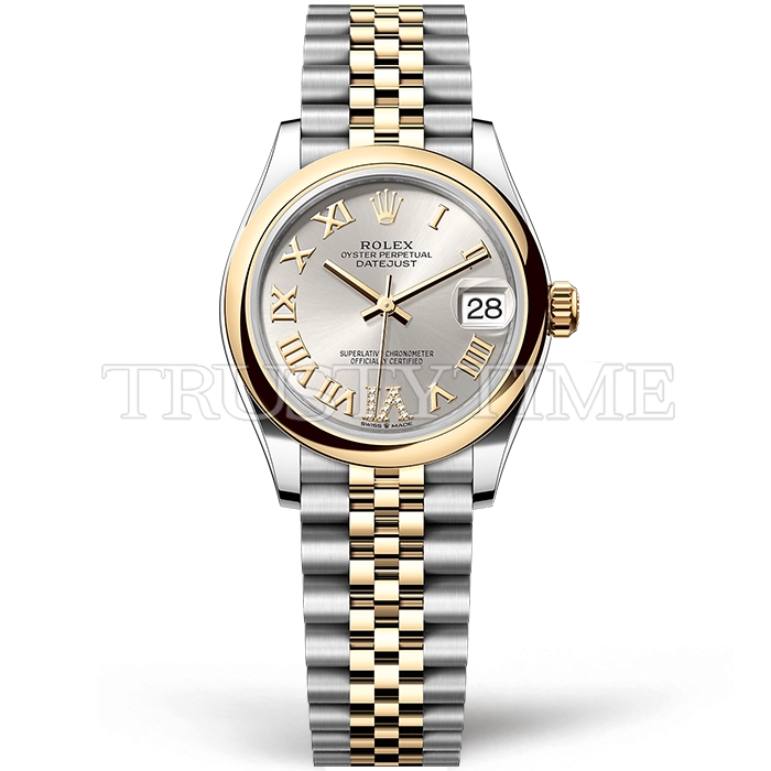 Часы Rolex из коллекции DateJust. Классические женские часы Rolex DateJust 31mm 278243-0004 премиального качества (Артикул магазина: RX-3200) оснащены надежным автоматическим механизмом с автоподзаводом (работает от амплитуды движения руки) калибра ETA2836-2, в котором реализованы следующие функции: часовая, минутная и секундная стрелки, а так же дата. Круглый корпус часов комбинированного сталь с желтого золота цвета, имеющий размер 31 мм и высоту 12 мм превосходно дополнит образ и украсит запястье своего обладателя. Для изготовления часов Rolex DateJust 31mm 278243-0004 предлагаемых в нашем интернет-магазине, применяются нержавеющая сталь 316F высокого качества (Швейцарский стандарт), а так же сапфировое стекло высокой прочности, благодаря чему обеспечивается максимальная защита от сколов и механических повреждений. Отличительной чертой данной модели является серебристый циферблат, часовые индексы которого обеспечивают римские цифры. Завершает образ браслет из нержавеющей стали комбинированного сталь с желтым золотом цвета с фирменной раскладывающейся застежкой Rolex. Водонепроницаемость данной модели составляет 30М (WR30) – допускается минимальное воздействие с водой.
