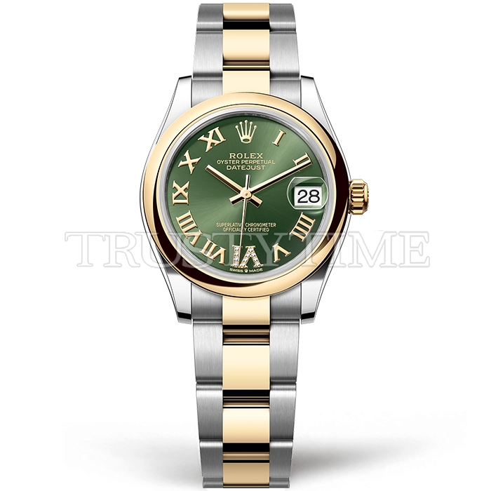 Часы Rolex из коллекции DateJust. Классические женские часы Rolex DateJust 31mm 278243-0015 премиального качества (Артикул магазина: RX-3205) оснащены надежным автоматическим механизмом с автоподзаводом (работает от амплитуды движения руки) калибра ETA2836-2, в котором реализованы следующие функции: часовая, минутная и секундная стрелки, а так же дата. Круглый корпус часов комбинированного сталь с желтого золота цвета, имеющий размер 31 мм и высоту 12 мм превосходно дополнит образ и украсит запястье своего обладателя. Для изготовления часов Rolex DateJust 31mm 278243-0015 предлагаемых в нашем интернет-магазине, применяются нержавеющая сталь 316F высокого качества (Швейцарский стандарт), а так же сапфировое стекло высокой прочности, благодаря чему обеспечивается максимальная защита от сколов и механических повреждений. Отличительной чертой данной модели является зеленый циферблат, часовые индексы которого обеспечивают римские цифры. Завершает образ браслет из нержавеющей стали комбинированного сталь с желтым золотом цвета с фирменной раскладывающейся застежкой Rolex. Водонепроницаемость данной модели составляет 30М (WR30) – допускается минимальное воздействие с водой.