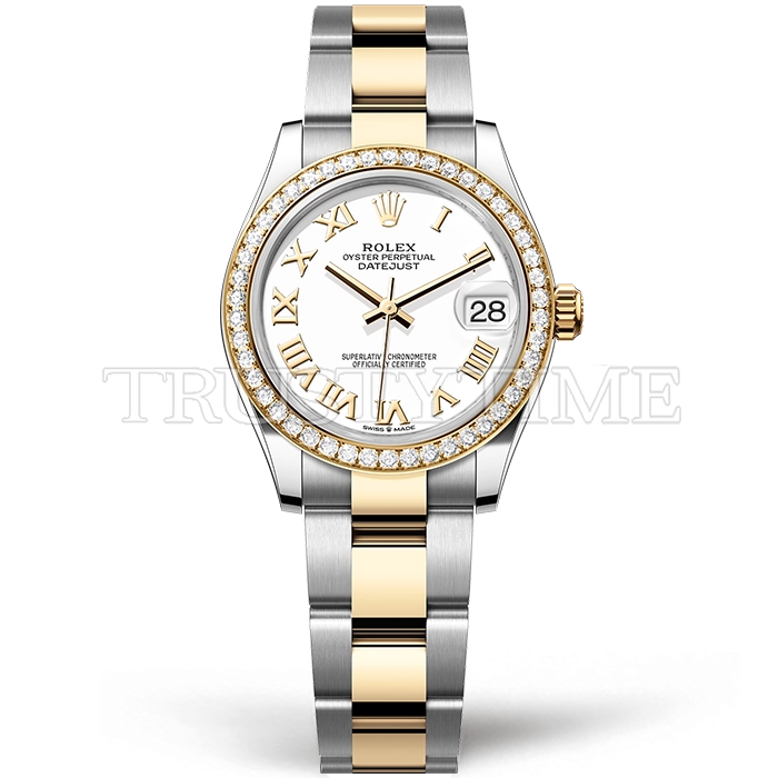 Часы Rolex из коллекции DateJust. Классические женские часы Rolex DateJust 31mm 278383RBR-0001 премиального качества (Артикул магазина: RX-3215) оснащены надежным автоматическим механизмом с автоподзаводом (работает от амплитуды движения руки) калибра ETA2836-2, в котором реализованы следующие функции: часовая, минутная и секундная стрелки, а так же дата. Круглый корпус часов комбинированного сталь с желтого золота цвета, имеющий размер 31 мм и высоту 12 мм превосходно дополнит образ и украсит запястье своего обладателя. Для изготовления часов Rolex DateJust 31mm 278383RBR-0001 предлагаемых в нашем интернет-магазине, применяются нержавеющая сталь 316F высокого качества (Швейцарский стандарт), а так же сапфировое стекло высокой прочности, благодаря чему обеспечивается максимальная защита от сколов и механических повреждений. Отличительной чертой данной модели является белый циферблат, часовые индексы которого обеспечивают римские цифры. Завершает образ браслет из нержавеющей стали комбинированного сталь с желтым золотом цвета с фирменной раскладывающейся застежкой Rolex. Водонепроницаемость данной модели составляет 30М (WR30) – допускается минимальное воздействие с водой.