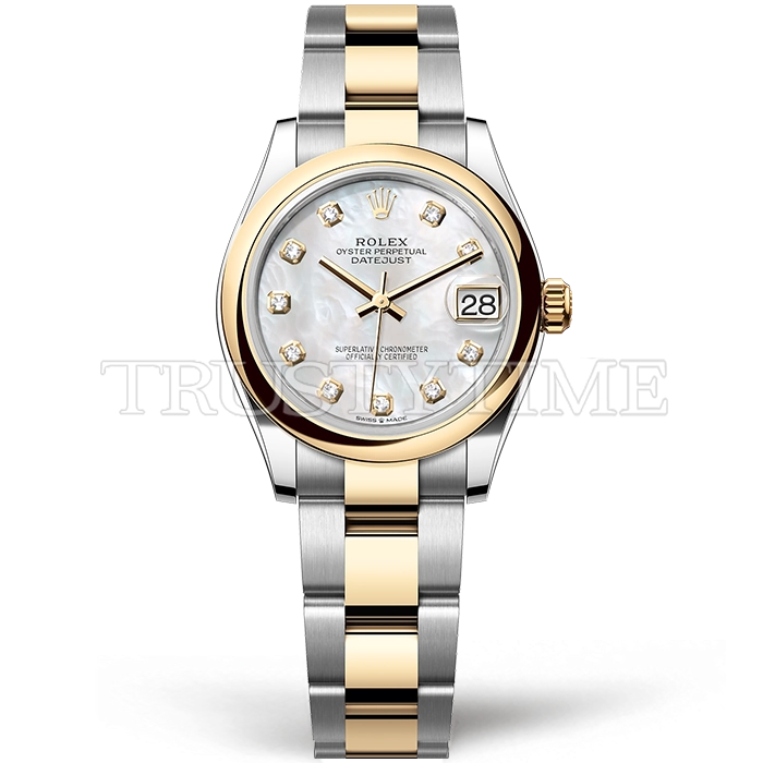 Часы Rolex из коллекции DateJust. Классические женские часы Rolex DateJust 31mm 278243-0027 премиального качества (Артикул магазина: RX-3239) оснащены надежным автоматическим механизмом с автоподзаводом (работает от амплитуды движения руки) калибра ETA2836-2, в котором реализованы следующие функции: часовая, минутная и секундная стрелки, а так же дата. Круглый корпус часов комбинированного сталь с желтого золота цвета, имеющий размер 31 мм и высоту 12 мм превосходно дополнит образ и украсит запястье своего обладателя. Для изготовления часов Rolex DateJust 31mm 278243-0027 предлагаемых в нашем интернет-магазине, применяются нержавеющая сталь 316F высокого качества (Швейцарский стандарт), а так же сапфировое стекло высокой прочности, благодаря чему обеспечивается максимальная защита от сколов и механических повреждений. Отличительной чертой данной модели является перламутровый циферблат, часовые индексы которого обеспечивают камни. Завершает образ браслет из нержавеющей стали комбинированного сталь с желтым золотом цвета с фирменной раскладывающейся застежкой Rolex. Водонепроницаемость данной модели составляет 30М (WR30) – допускается минимальное воздействие с водой.